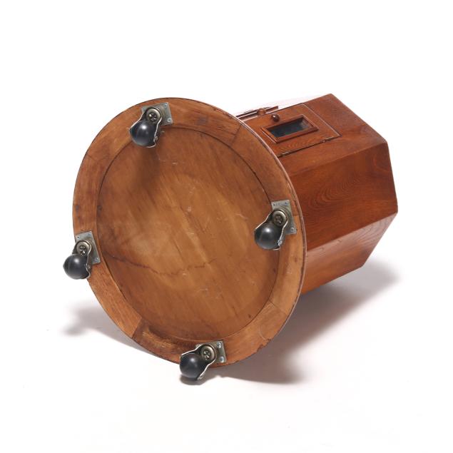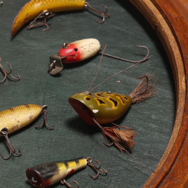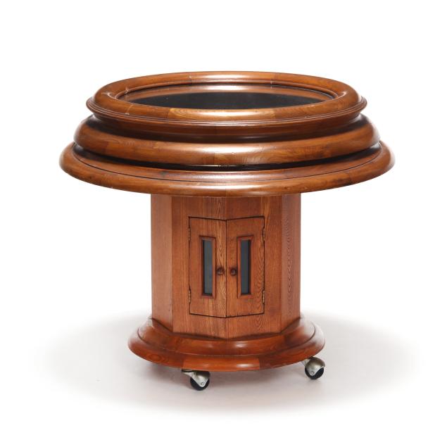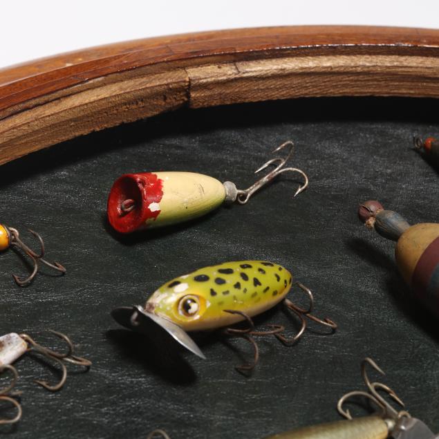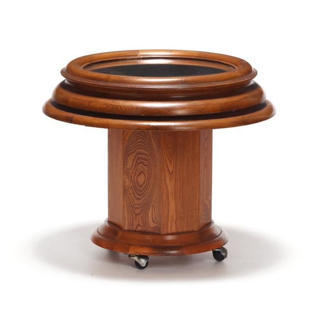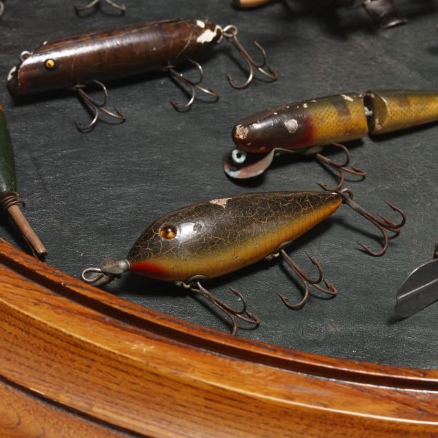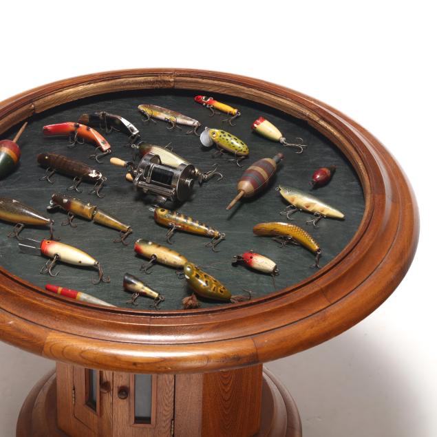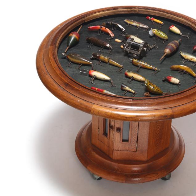 Second half 20th century, three-part oak form, removable circular glass top with leather display area, set on octagonal support with two hinged doors, circular base on casters, No. 252 "Symploreel" Level Winder reel, four wooden bobbers, eighteen vintage lures.