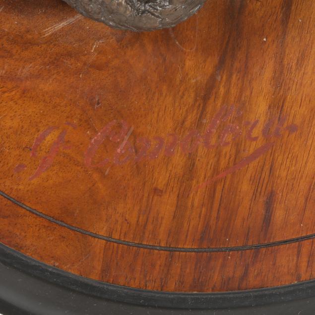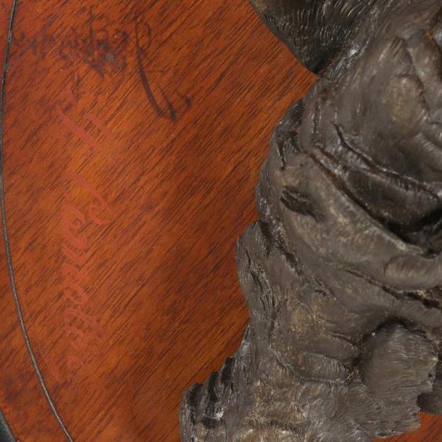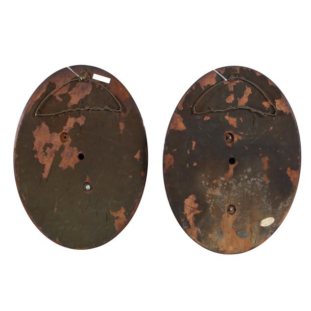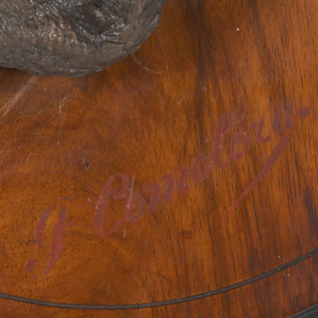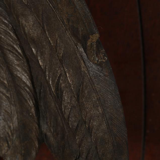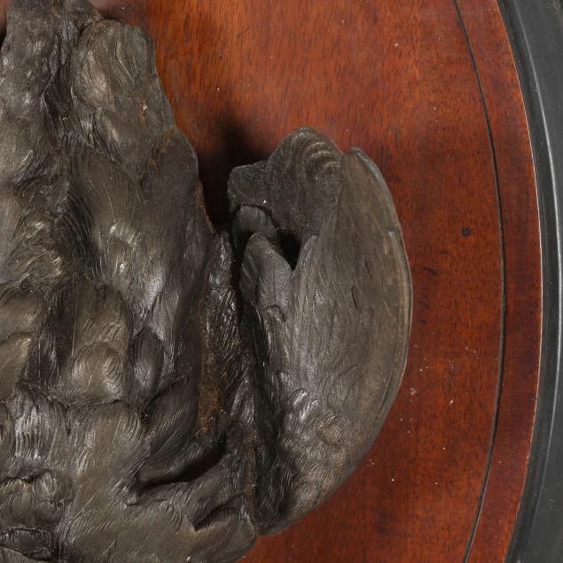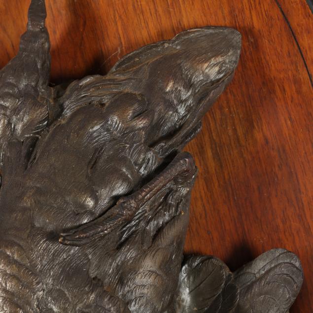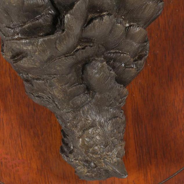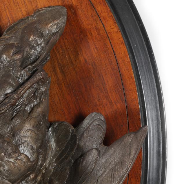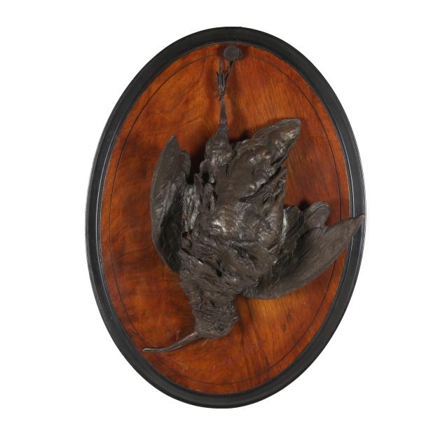 Paris, France, circa late 19th century, patinated cast spelter on wooden wall plaque featuring ebonised frame edge and enclosed line circling birds, each marked P. COMOLERA at bottom.