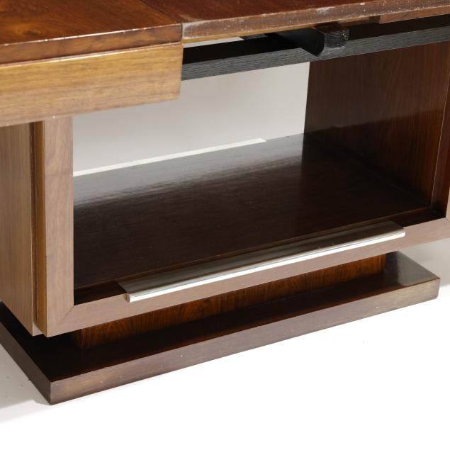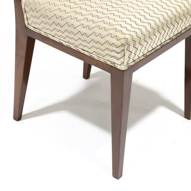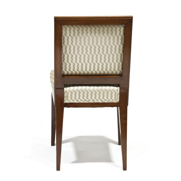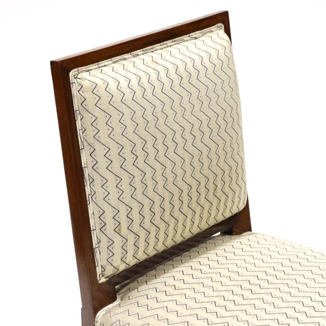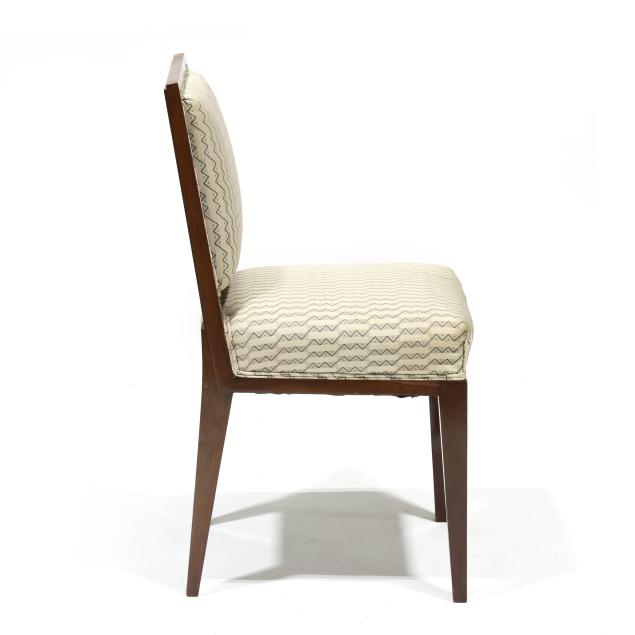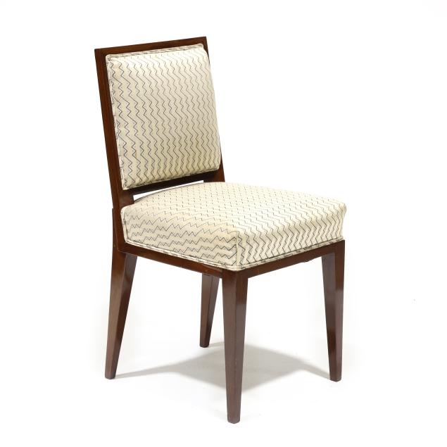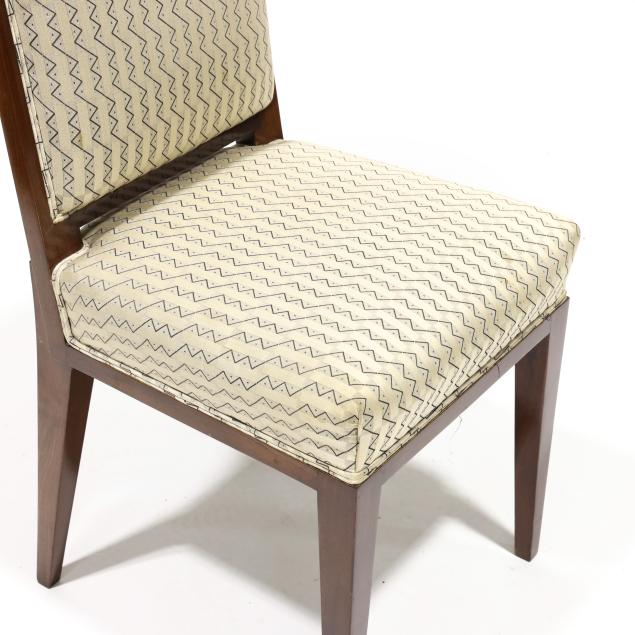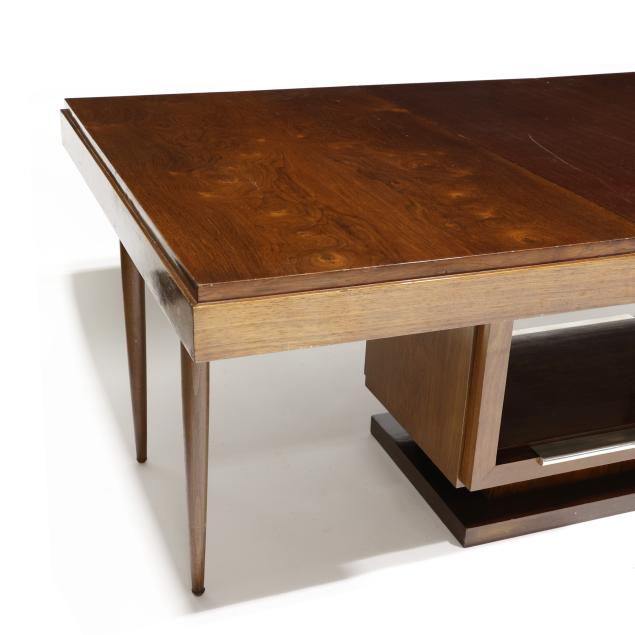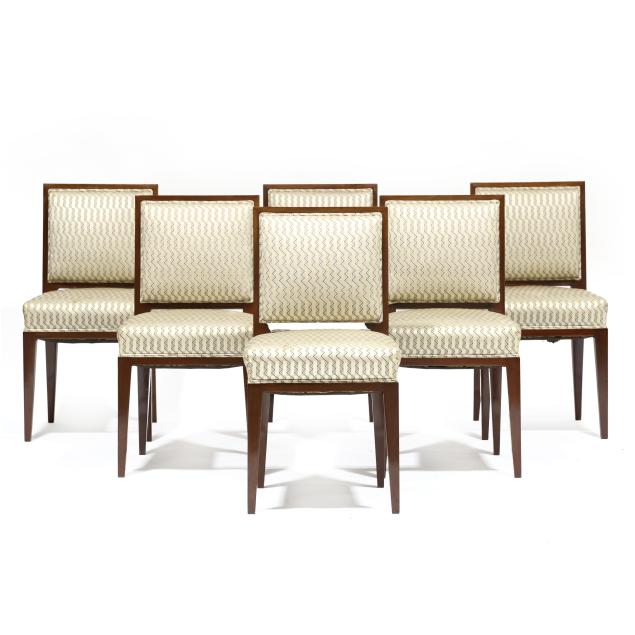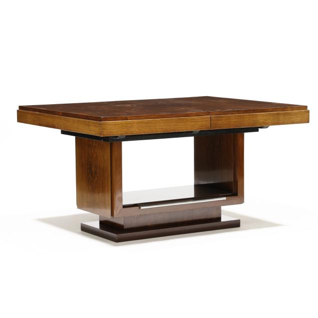 Circa 1930, mahogany and rosewood veneers, including a rectangular table with raised panel top, stylized trestle form base with polished aluminum highlights, together with two leaves in mahogany veneer (30 x 43.5 x 55 in.); with six side chairs in later but appropriate geometric upholstery, linear form with raised panel rear leg stiles, straight tapered front legs, unmarked (32.5 x 17 x 17 in., seat height 18 in.).
