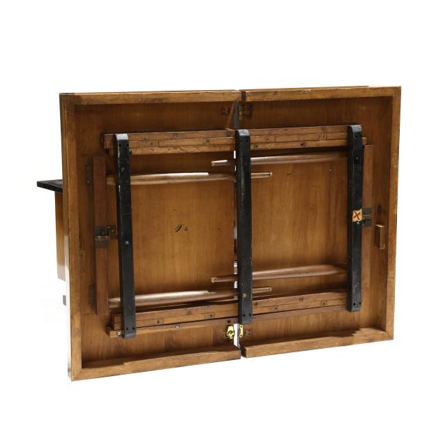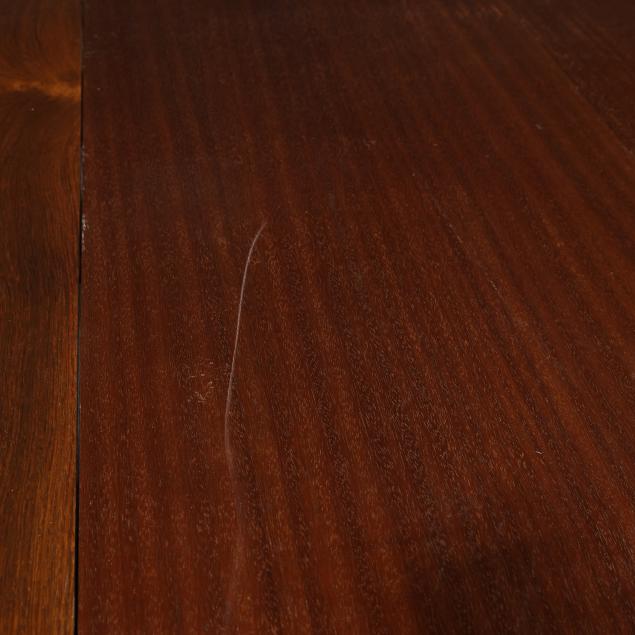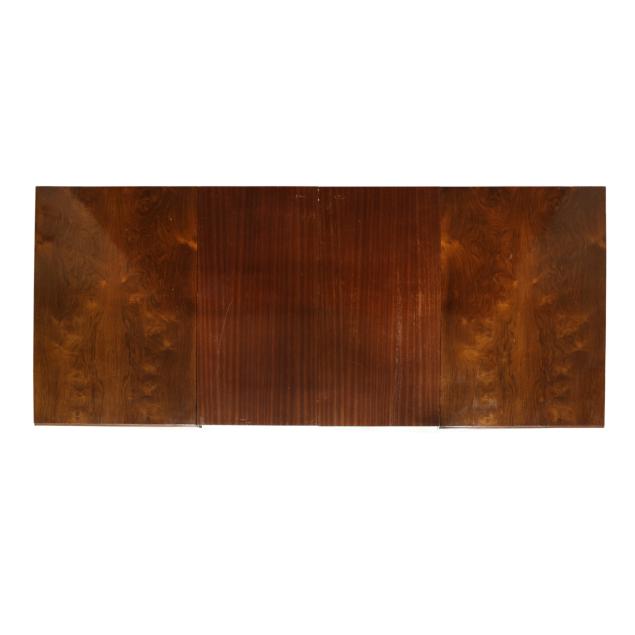 From the Estate of the late Joel Hasen, Chapel Hill, North Carolina Rosewood table top with some light surface scratches; note that the leaves appear original but are finished in mahogany, some light surface scratches to the leaves; chairs with later upholstery and some staining; scuffs to the feet.