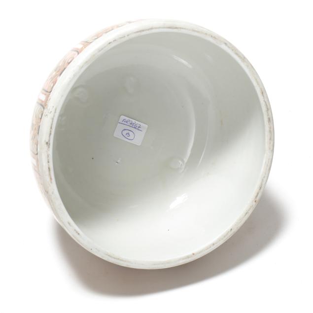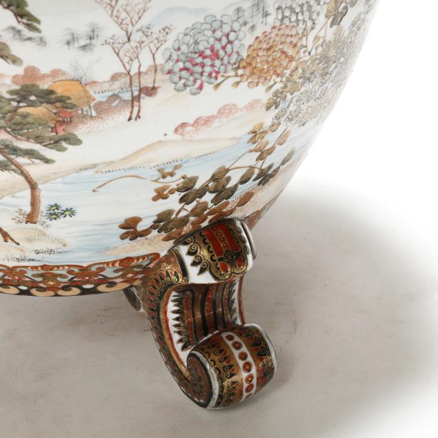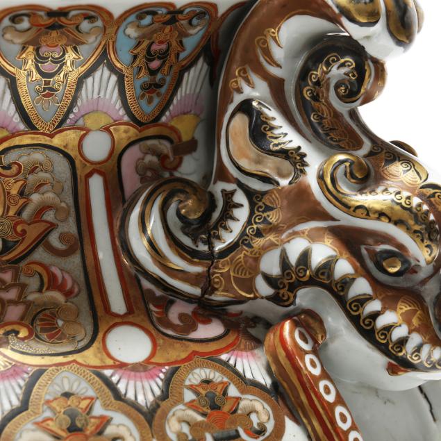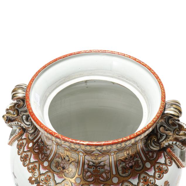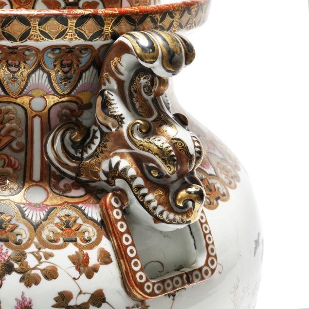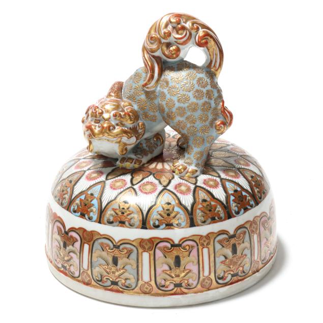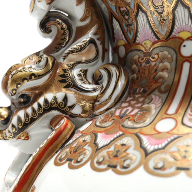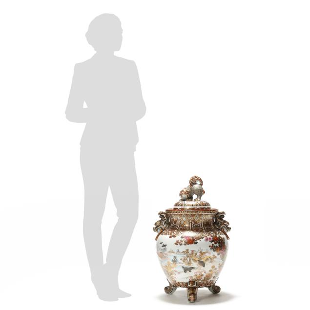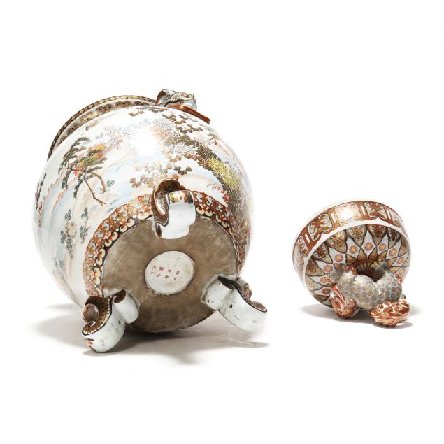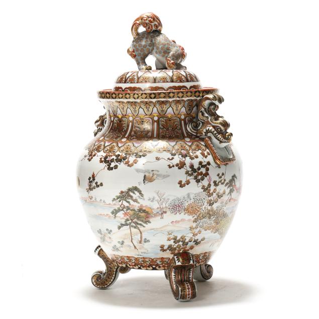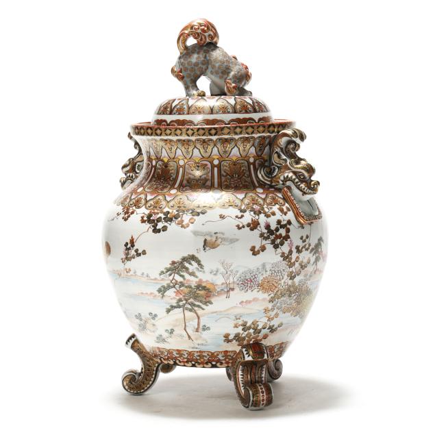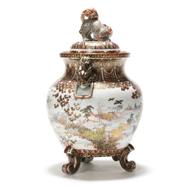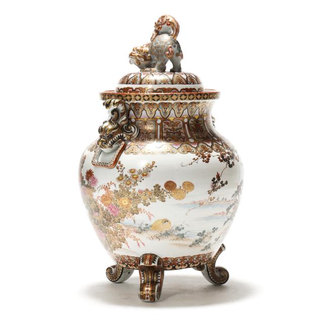 Late 19th or early 20th century, kutani yaki ware from Kaga, porcelain hand painted in gilt and colors, elaborately decorated with patterned borders and a scenic landscape with autumn flowers and quails, the cover is topped with a lively foo lion, fanciful foo lion heads flanked the upper body of the urn, the urn is raised on three scroll feet, underside with inscription.
