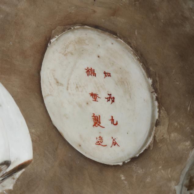Breaks and repairs and firing cracks to both handles; breaks and repairs with associated restoration to one foot; minor gilt rubbing.