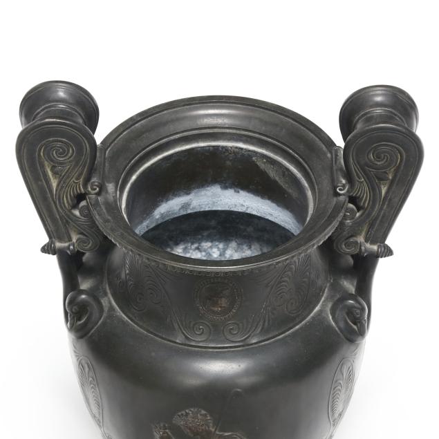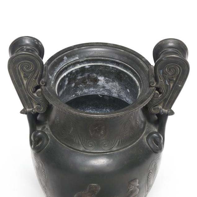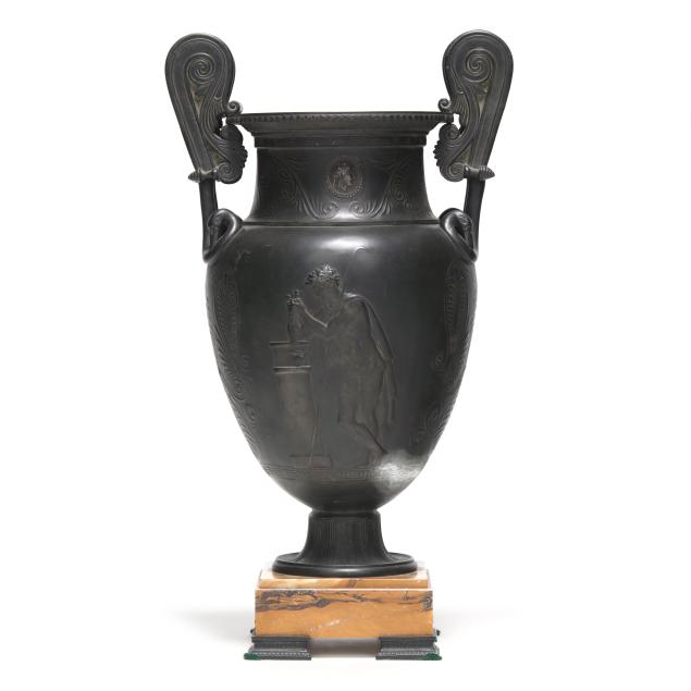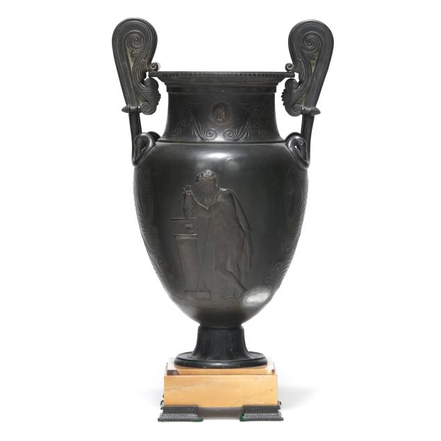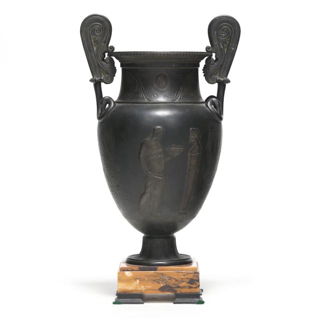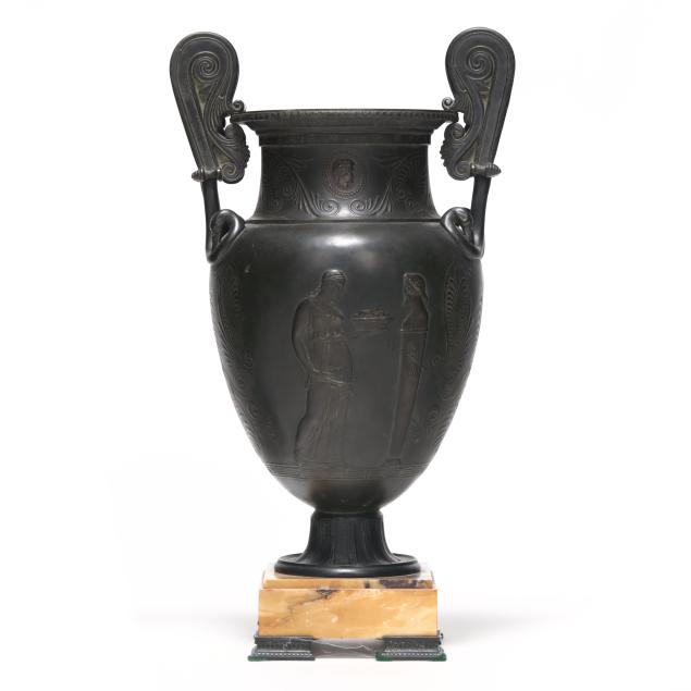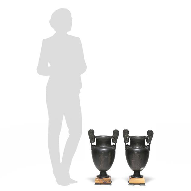 Late 19th century, patinated bronze krater vases with rising volute double handles, flanking a waisted neck with central profile medallions, over an ovoid body decorated with bas-relief mythological scenes surrounded by palmettes and anthemions, above a squat pedestal foot and mounted atop an orchre marble base with four cast feet.