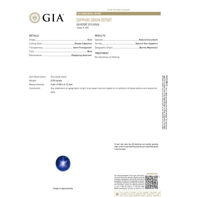 Accompanied by GIA report number 3515149456 stating Natural Corundum / Natural Star Sapphire from Burma (Myanmar) with no indications of heating.