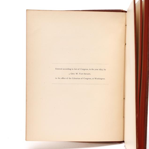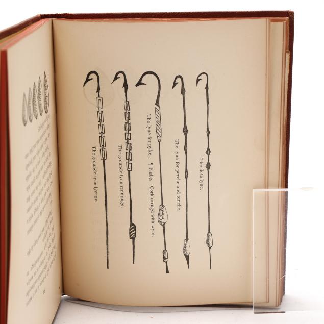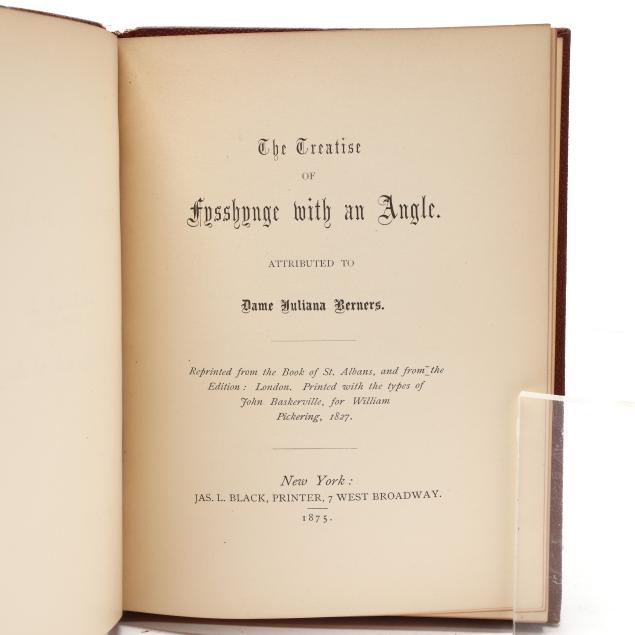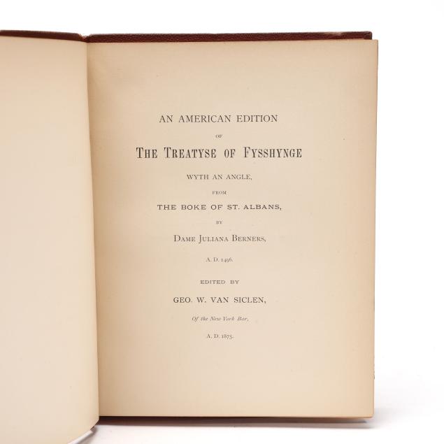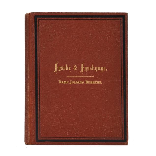 Dame Juliana Berners; Geo. W. Van Siclen. AN AMERICAN EDITION OF THE TREATYSE OF FYSSHYNGE WYTH AN ANGLE, FROM THE BOKE OF ST. ALBANS, BY DAME JULIANA BERNERS, A. D. 1496. New York: James L. Black, 1875. First American edition. Hardcover. In the original pebbled rust colored cloth boards stamped in gilt and black, with all edges red. 12mo; 118pp. Reprinted from the 1827 London Pickering edition. With a new preface by Van Siclen, the preface to the 1827 English edition, illustrations, and glossary.