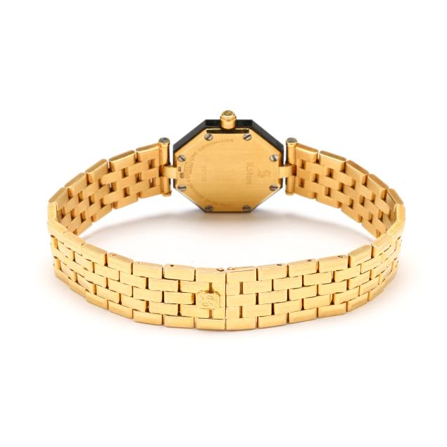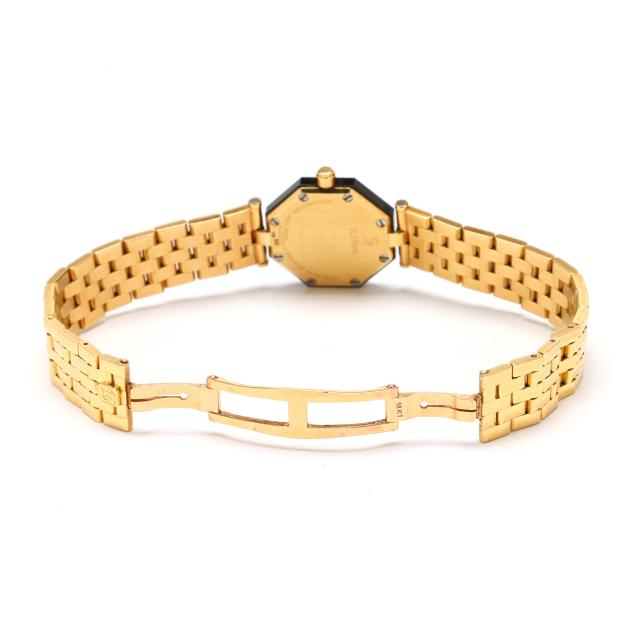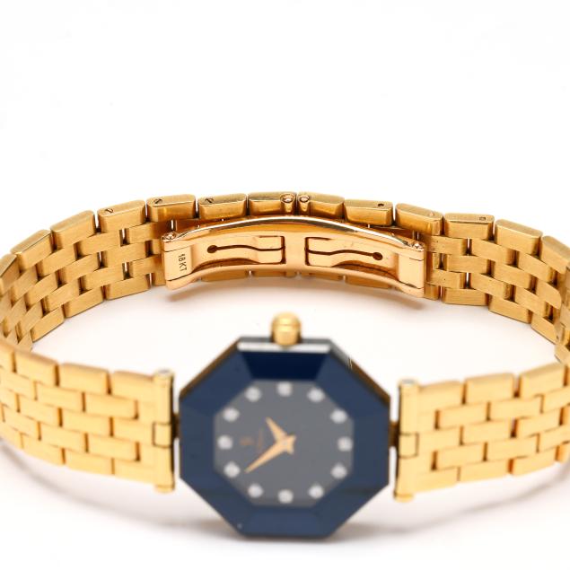Quartz, ETA 280.002 movement, serial number 16136, the octagonal faceted sapphire case with signed blue dial, diamond hour markers, and gold Dauphine hands, the gold bracelet with brick pattern links, completed with hidden butterfly clasp stamped 18KT, the signed caseback numbered and stamped with Swiss hallmarks and 750.
