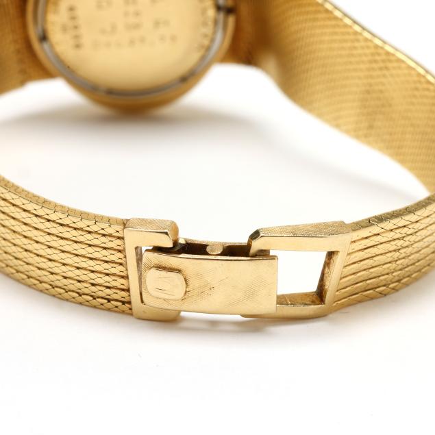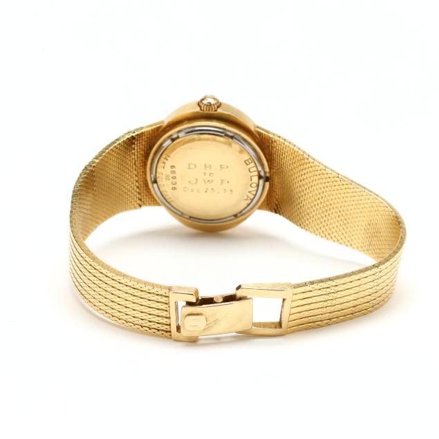 Circa 1973, Bulova Accutron 2302 movement, reference number B729, serial number 68936, the oval gold case with signed blue dial, baton hour markers and hands with center orange second sweep, and date window at 12:00 hour, the gold bracelet with linear design, completed with signed fold over clasp stamped 14K, the signed caseback stamped 14KT GOLD CASE, numbered 68936, date code N2, and presentation engraving D.H.P. / TO / J.W.P. / Dec.25, 73.
