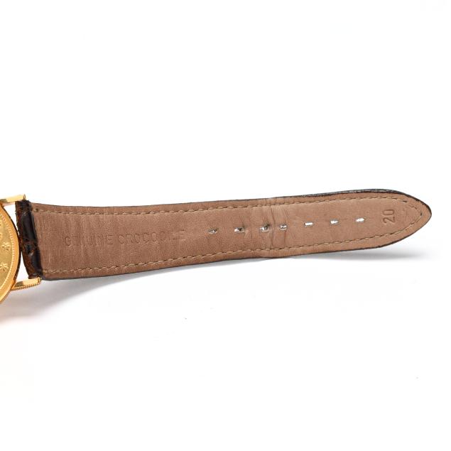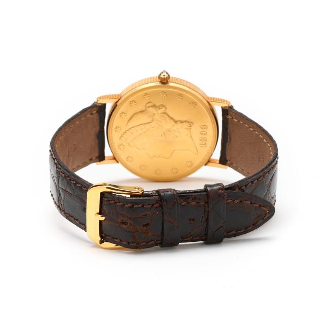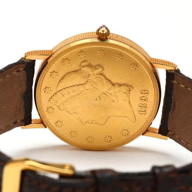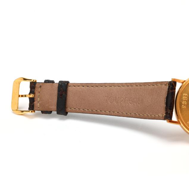 Quartz, movement serial number 228619, case number 408942, the round gold case with milgrain bezel, coin edge caseband, diamond set crown, and Swiss hallmark for 18KT, the signed gold dial with the reverse of the coin depicting the Great Seal of the United States, black sword hands, and date window at 3:00 hour, the brown leather strap embossed Tourneau / Genuine Crocodile and completed with gold-tone buckle, the caseback with obverse of coin depicting the Liberty Head and dated 1893, the interior signed and with Swiss hallmarks for 18KT.