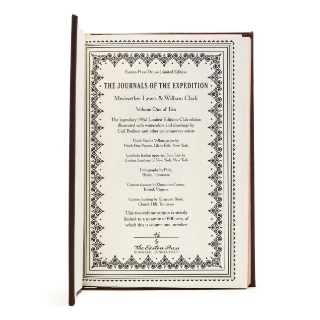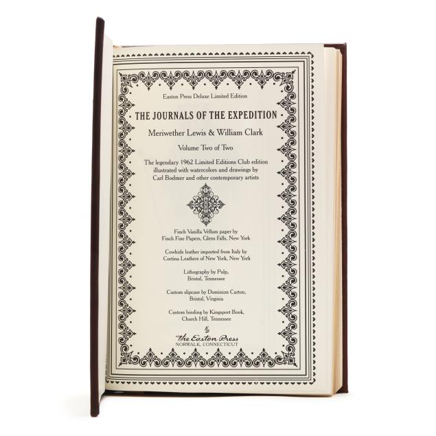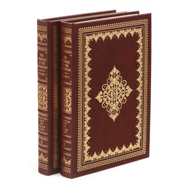 Meriwether Lewis and William Clark. THE JOURNALS OF THE EXPEDITION. (2) volumes (complete). Norwalk, CT: The Easton Press, 2015. Limited edition; no. 46 of 800 copies. Hardcovers. Gilt-decorated Italian cowhide leather with gilt lettering and raised bands on the spine, marbled endpapers, all edges gilt, and ribbon bookmark; in gilt-decorated brown cloth slipcase with lined interior. 4to; xlv, 231, [1]pp.; xviii, 233-547, [1]pp. With in-text illustrations and color plates, and each with folding map at the rear.