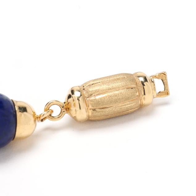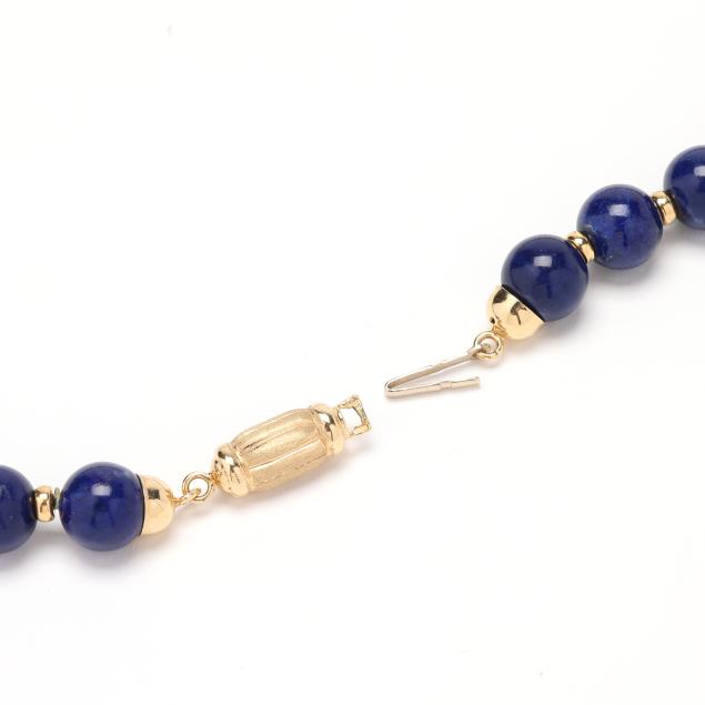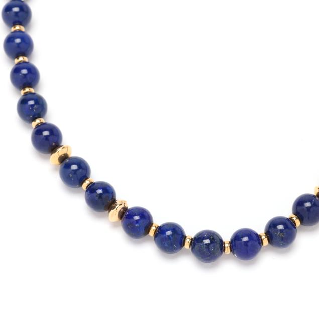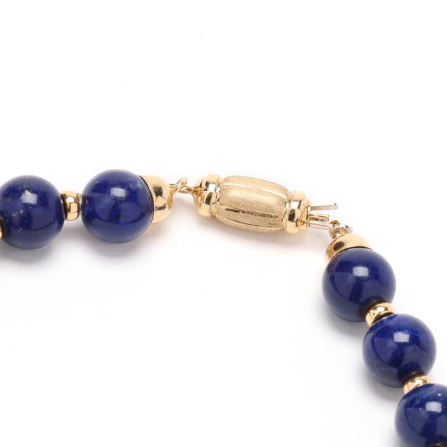 Strung alternating with (36) lapis lazuli beads (10mm) and (35) gold rondelle and disc beads, completed with a barrel clasp, stamped with Italian registry 532 VI and 585.