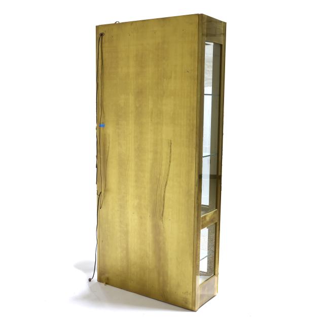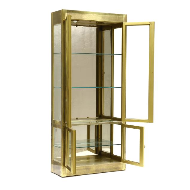 Circa 1970, one part lighted form, brass wrapped case with four hinged deep molded doors with beveled glass panes, mirrored back interior with glass shelves, flush base, labeled.