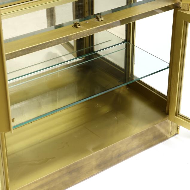 Some minor spotting to the brass; lighting not tested; includes three glass shelves and one glass waist panel.