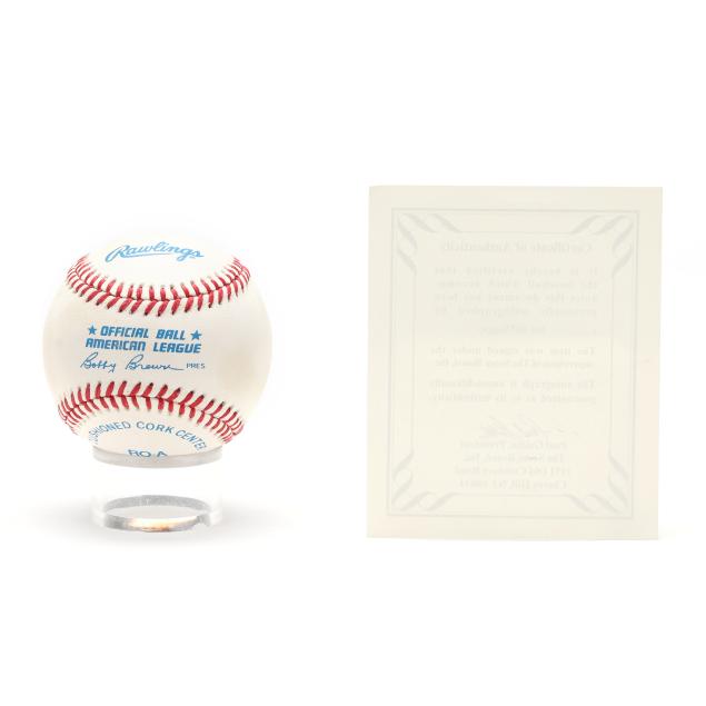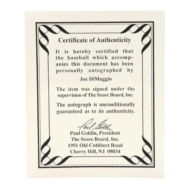 Rawlings leather baseball signed by Joe DiMaggio (1914-1999), certificate of authenticity from The Score Board, Inc.