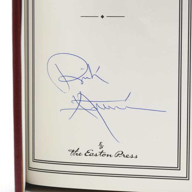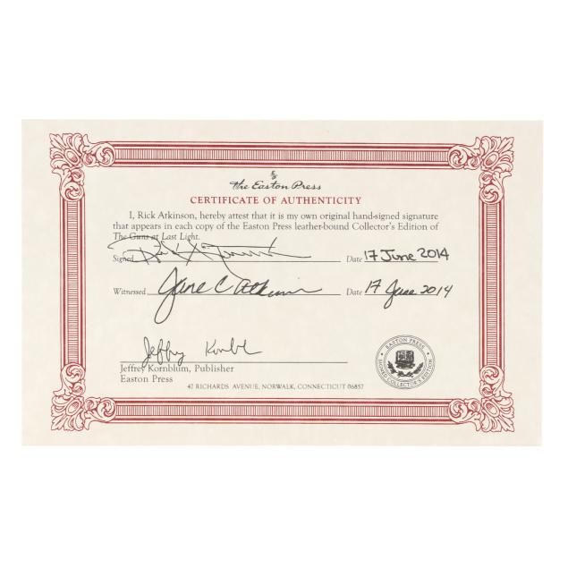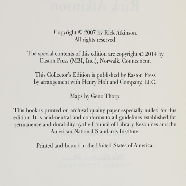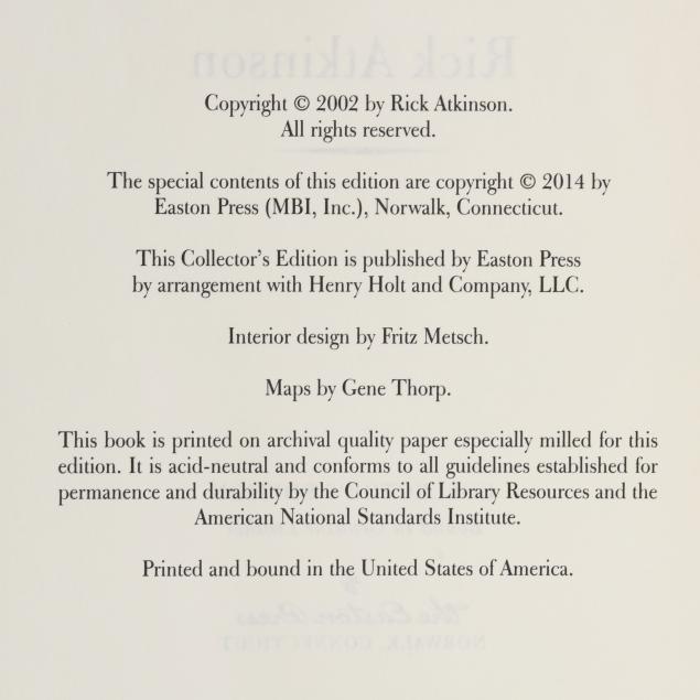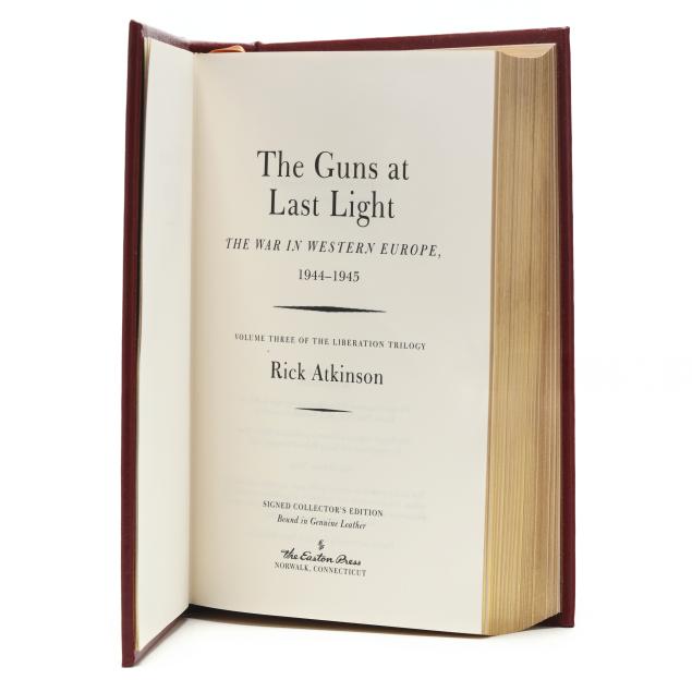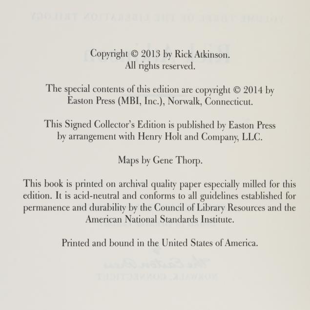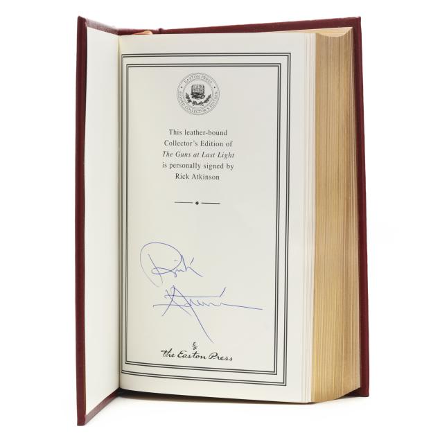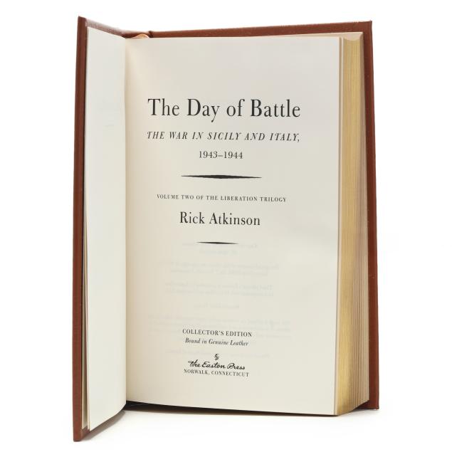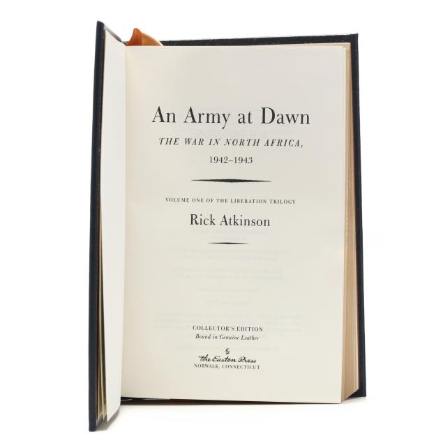 Rick Atkinson. THE LIBERATION TRILOGY. (3) volumes (complete); including: An Army at Dawn, The Day of Battle, and The Guns at Last Light. Norwalk, CT: The Easton Press, 2014. Collector's edition. With the third volume signed by Atkinson (with Easton Press Certificate of Authenticity laid in loose). Hardcover. Bound in gilt-stamped genuine leather with raised bands on the spine, moire endpapers, all edges gilt, and satin ribbon bookmark. 8vo; [xiv], 681, [1]pp.; [xviii], 791, [3]pp.; [xvi], 877, [1]pp.