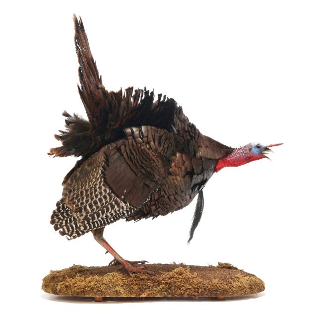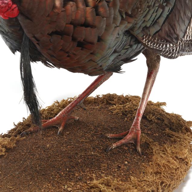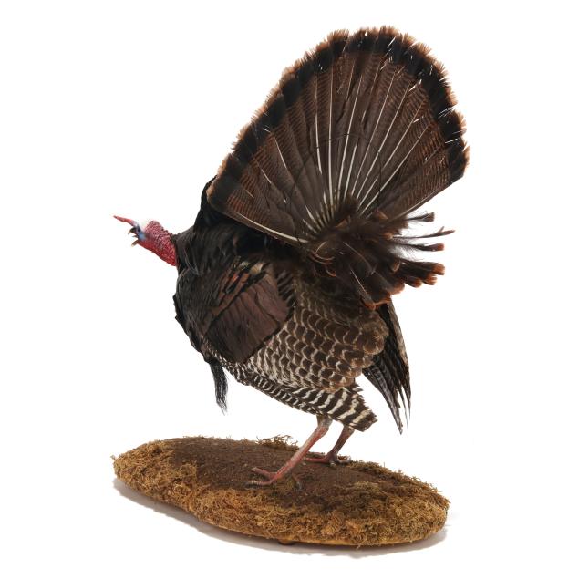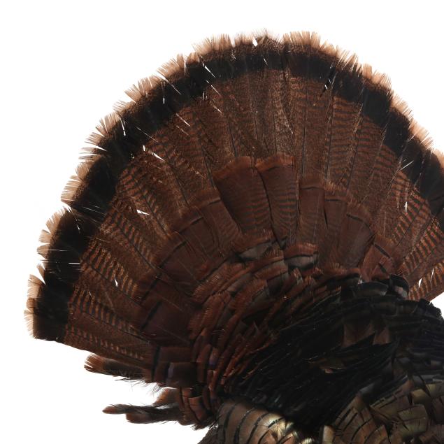 Measures 40 in. from base to tip of tail feathers, fan is 27 in. wide, 8.5 in. beard, mounted to wooden base with natural and artificial elements.