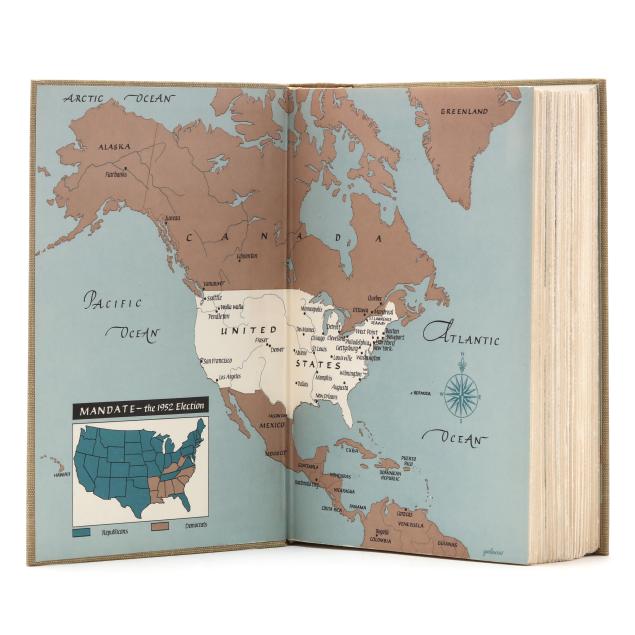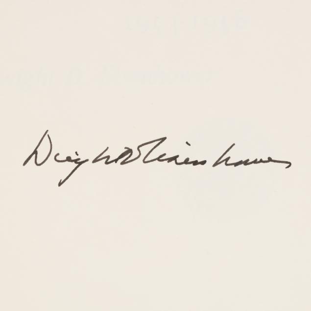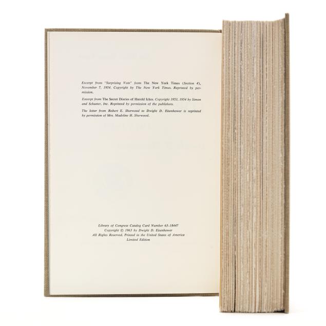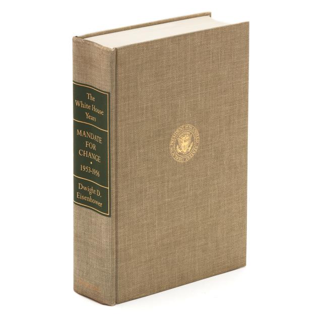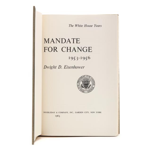 Dwight D. Eisenhower. THE WHITE HOUSE YEARS: MANDATE FOR CHANGE 1953-1956. Garden City, NY: Doubleday & Company, 1963. Limited edition; no. 1402 of 1434 signed and numbered copies (from a total of 1500). Signed by Eisenhower on a tipped-in leaf after the limitation. Hardcover. Pale green cloth-covered boards, stamped in gilt with presidential seal on the upper board, and gilt-lettering on green label on the spine, in clear acetate jacket; in original slipcase. 8vo; xviii, [ii], 650pp. With illustrations and maps, including at endpapers.
