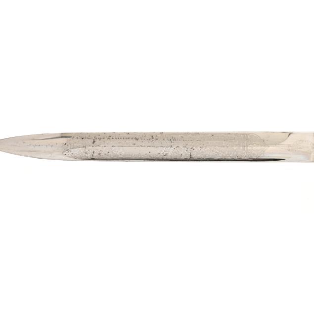 Text of SOLINGEN F.W. HOLLER present on bayonet near hilt, text of FUR ERINNERUNG AN MEINE DIENSTZEIT present on blade surround by engraved foliage, soldiers, artillery, and tank images.