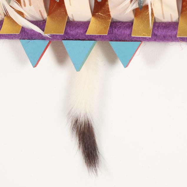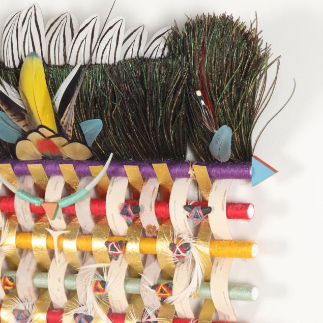 Kuwanlelenta is just one example of his vibrant and intricate mixed media sculptures that utilize organic materials like bird feathers, animal fur, porcupine quills, carved wood, and hand-made paper. Currently living and working in New Mexico, McCarthy's pieces and titles nod to the art and culture of Southwestern Native American tribes, including the Hopi, from which he draws inspiration.