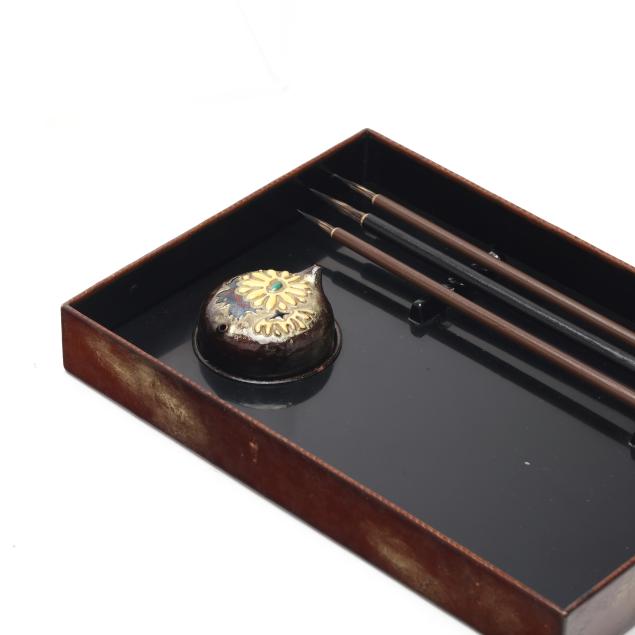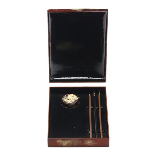 suzuribako (writing box) decorated in moriage relief with large chrysanthemum blooms in yellow enamel to the cover, the interior of black lacquer with an enameled copper alloy water dropper decorated in same manner as cover, with three brushes set in interior holders, underside of box with the Ando mark, presented together with an orange cloth and wooden