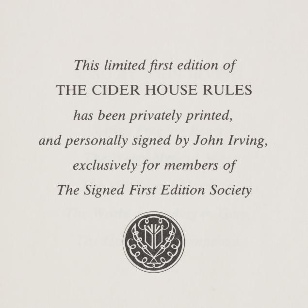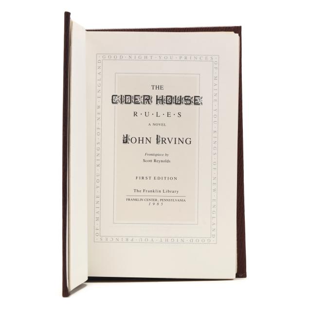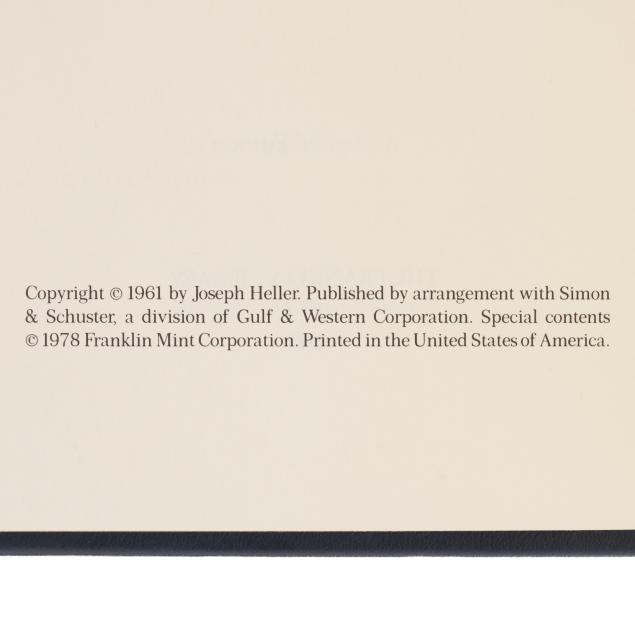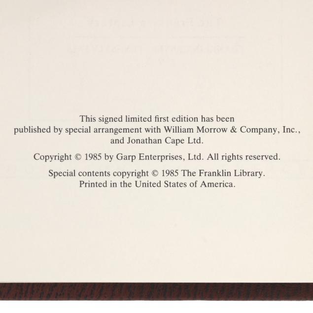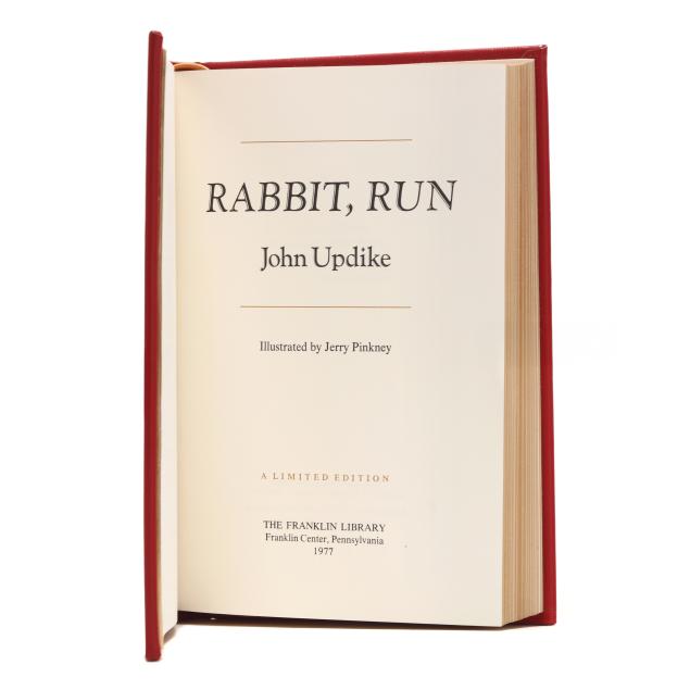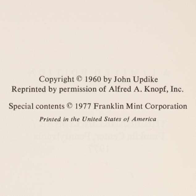 Franklin Center, PA: The Franklin Library, 1977-98; all 8vo and bound in gilt-decorated full leather with raised bands on the spine, decorative paper or moire endpapers, satin ribbon bookmark, and all edges gilt. To include: (5) books signed by the author as part of the Signed First Edition Society series, including one in slipcase; (10) author-signed limited editions, including books by Joseph Heller, John Updike, John Fowles, and others; and (5) unsigned books including three from the 100 Greatest Books of All Times series, one from the Pulitzer Prize Classics series, and one from the 100 Greatest Masterpieces of American Literature series.