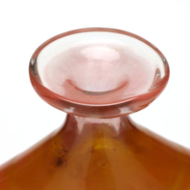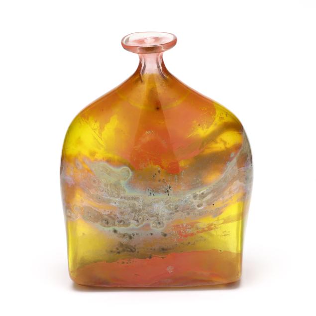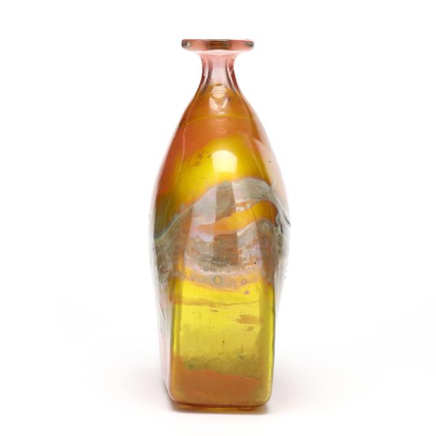 1972, blown bottle vase in orange glass with silver overlay highlights, signed and dated to base.