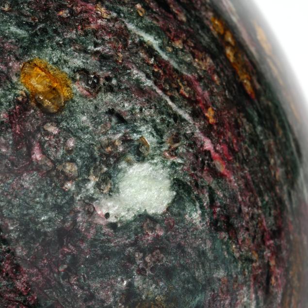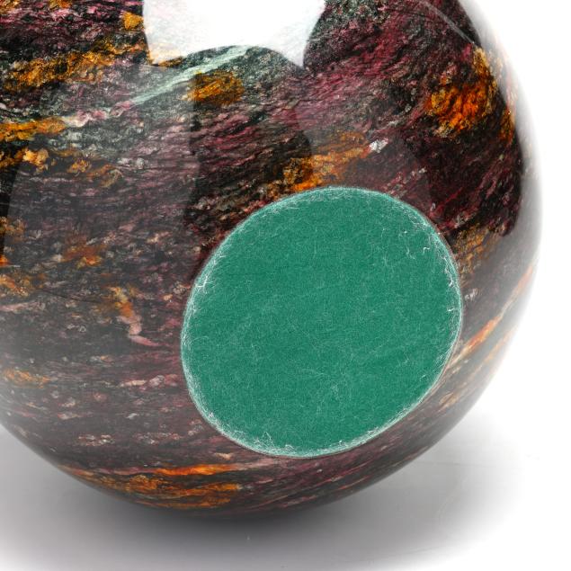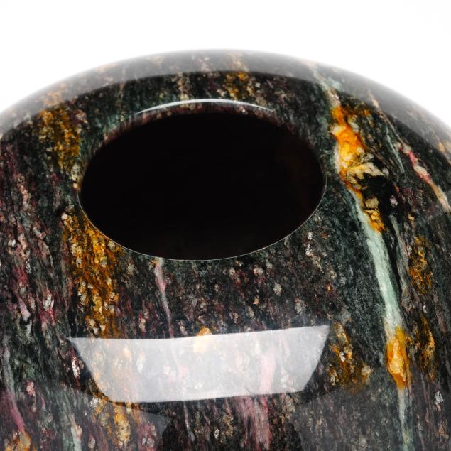 Contemporary, ovoid form vase formed with turned and polished hardstone with multicolor veins, unsigned.