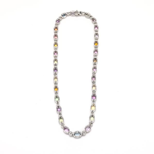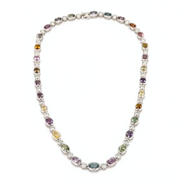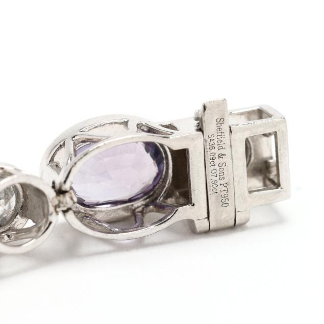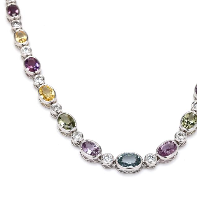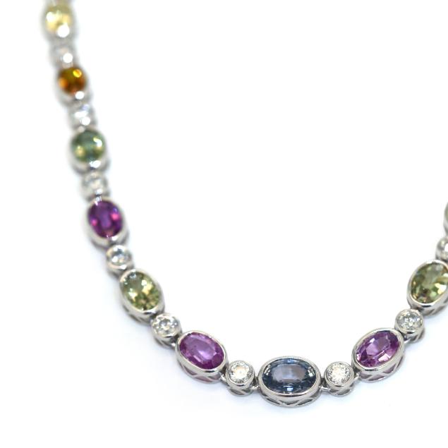 consisting of (30) graduated bezel set oval cut multicolored sapphires (7.0 x 5.0mm - 9.5 x 6.5mm) weighing 36.09 total carats and (31) bezel set full cut round diamonds (4mm) weighing 7.90 total carats (G-H color, SI2-I1 clarity), completed with an integrated box clasp and fold under safety, stamped Sheffield & Sons PT950 / SA36.09ct D7.90ct for stone weights.