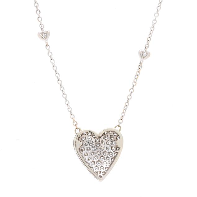 The heart shaped pendant pavé set with full cut round and single cut diamonds, suspended from a heart station cable chain necklace, each station set with a full cut round diamond to each side, completed with a lobster clasp, stamped with Italian registry number 319 AL and 750 / Italy. The total diamond weight approximately 1.75 carats (H-I color, SI1-SI2 clarity).