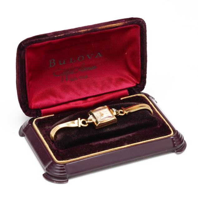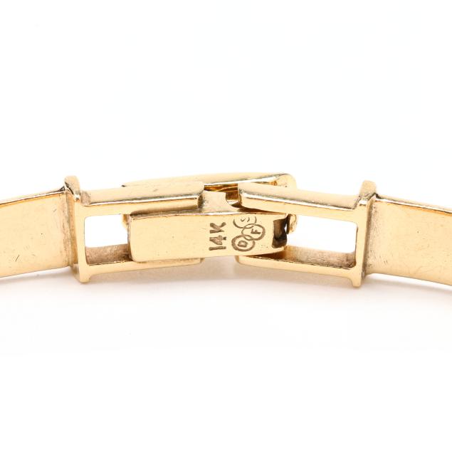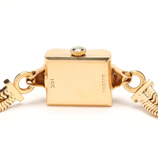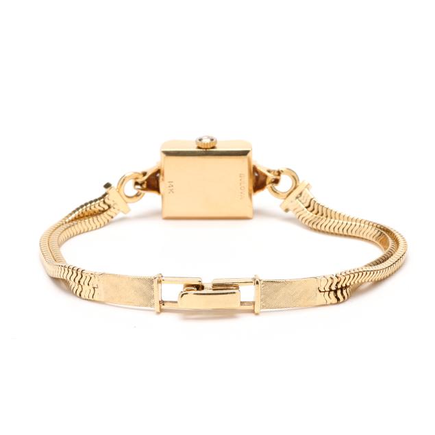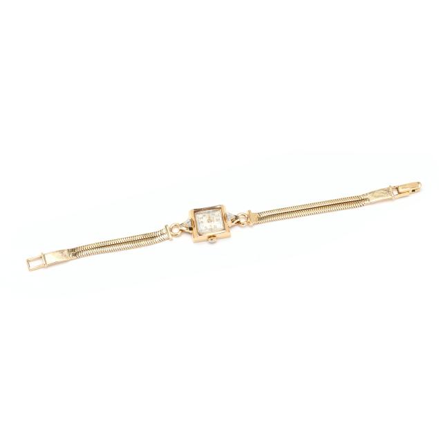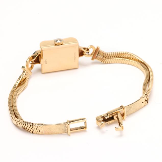 Manual wind, Qualco 5G3B8 movement, serial number 501559, the rectangular gold case with single cut diamond set lugs, the signed silver-tone dial, gold-tone Arabic numeral hour markers, and gold-tone modern style hands, the gold double strand rectangular snake chain bracelet with fold over clasp stamped 14K and with a maker's mark, the caseback signed and stamped 14K.