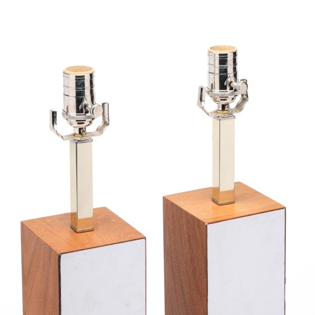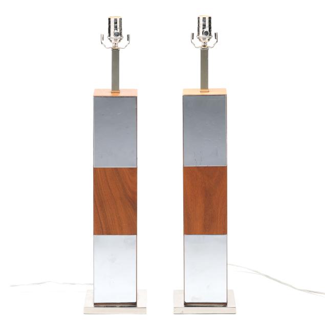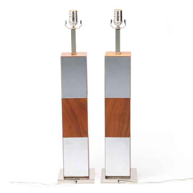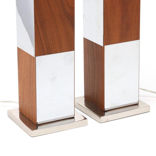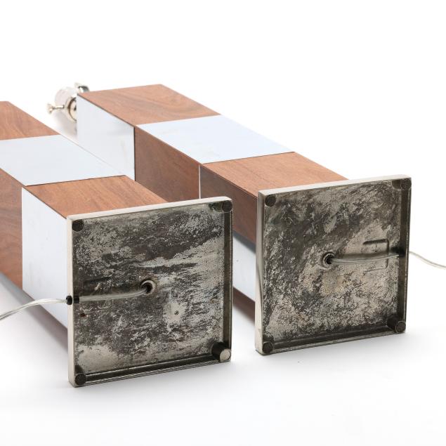 Circa 1970, likely by Laurel Lamp Company, rectangluar walnut wood panels alternating with chromed metal, unmarked.