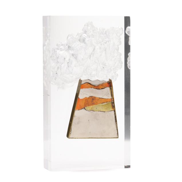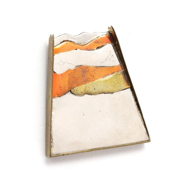 Mixed metals brooch mounted on a carve lucite stand, limited edition of 10, signed, numbered, and titled along the stand side.
