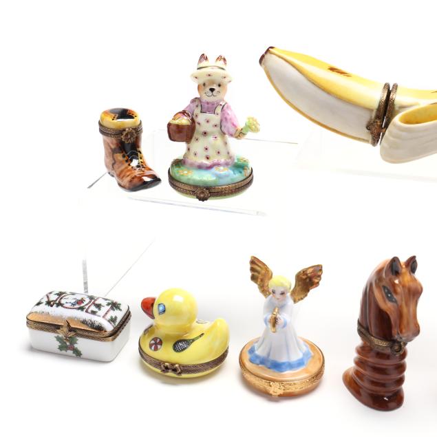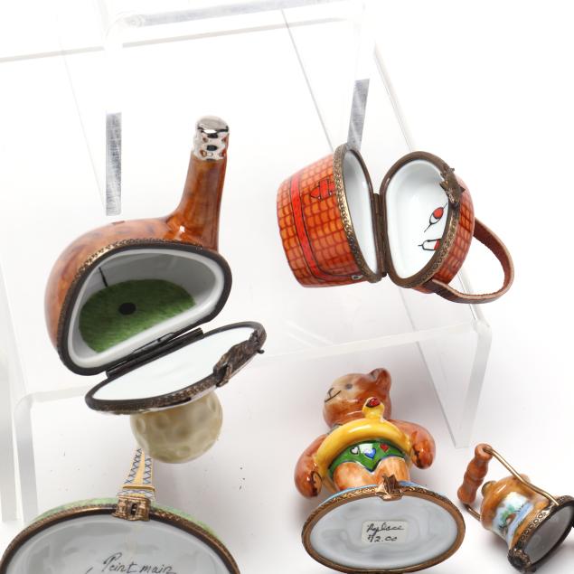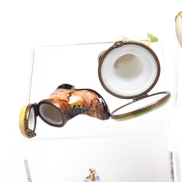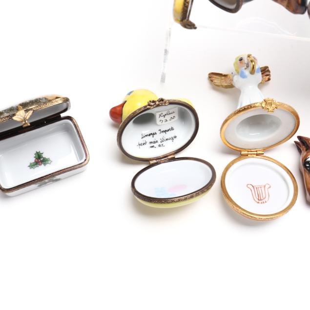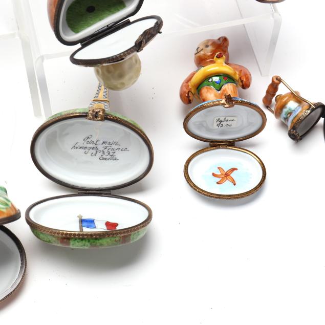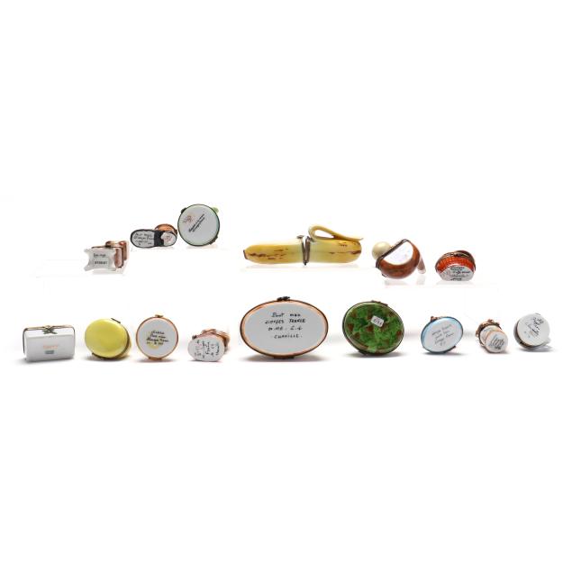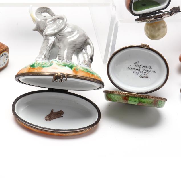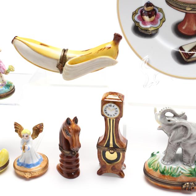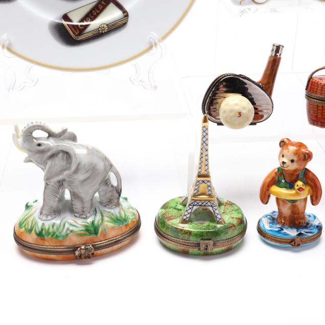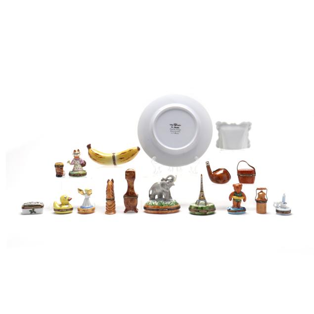 France, to include (15) assorted animal and object shaped pill boxes including (9) with original packaging, all marked to interior or bottom (tallest 4 1/2 in.); a display sign (3 x 3 3/4 x 1 3/4 in.); and an "Email de Limoges" dessert plate, marked to underside (7 3/4 in.).