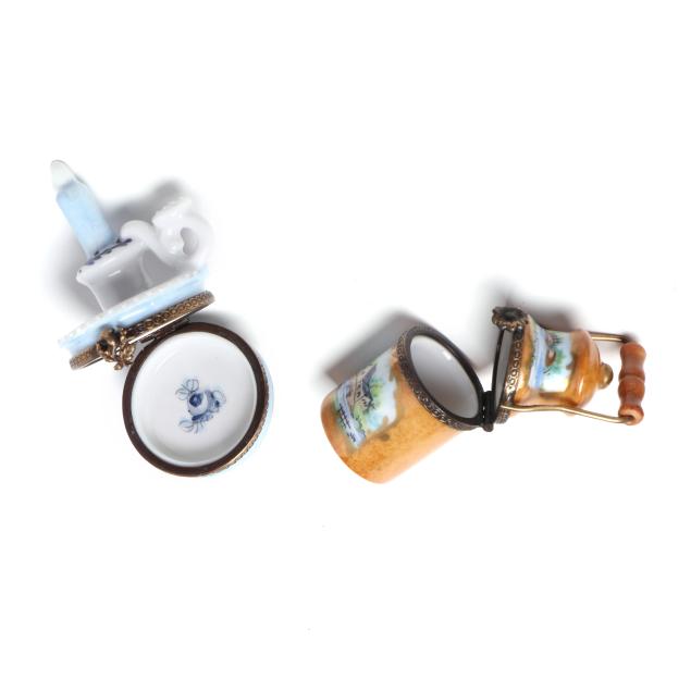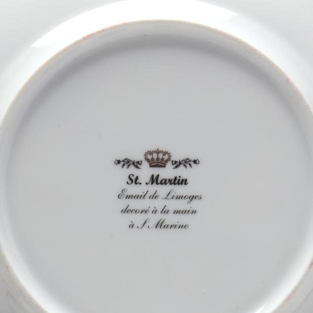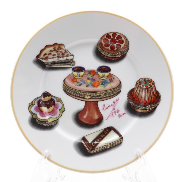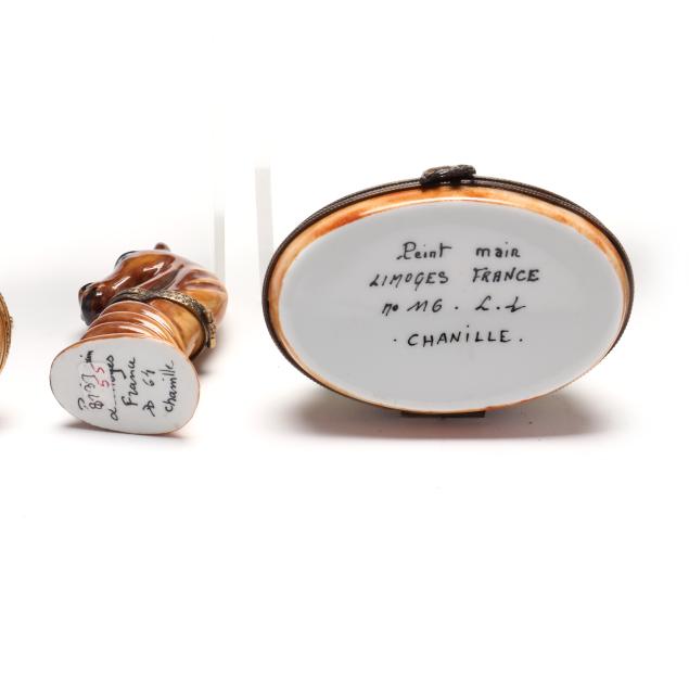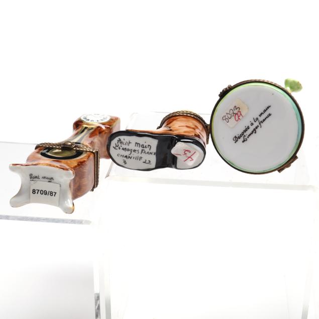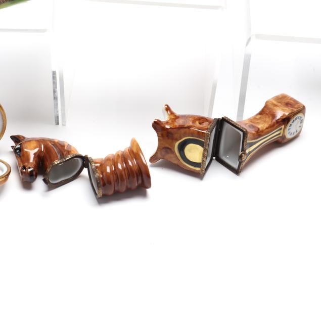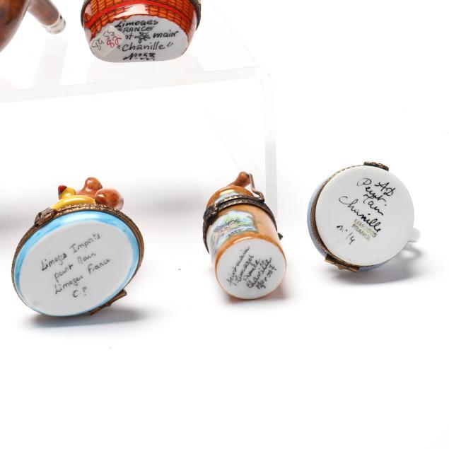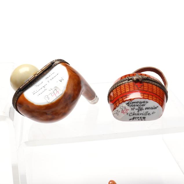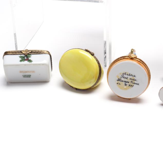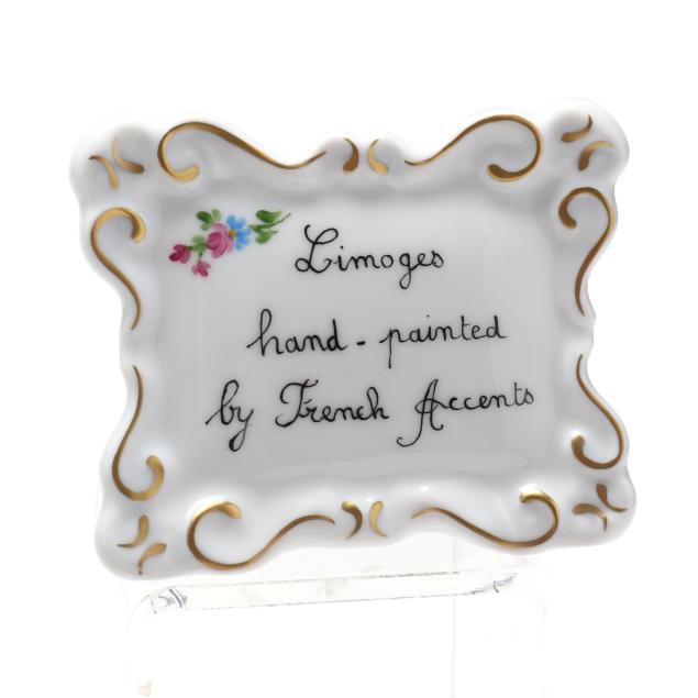 France, to include (15) assorted animal and object shaped pill boxes including (9) with original packaging, all marked to interior or bottom (tallest 4 1/2 in.); a display sign (3 x 3 3/4 x 1 3/4 in.); and an "Email de Limoges" dessert plate, marked to underside (7 3/4 in.).