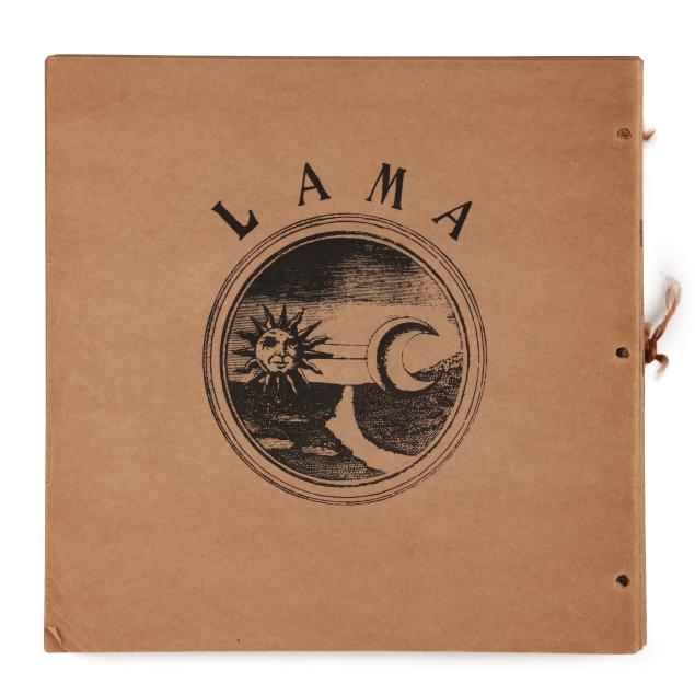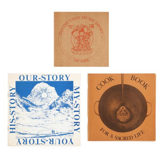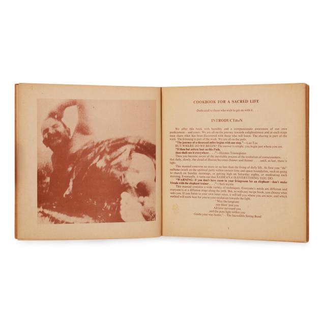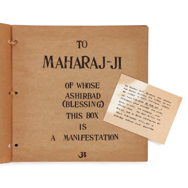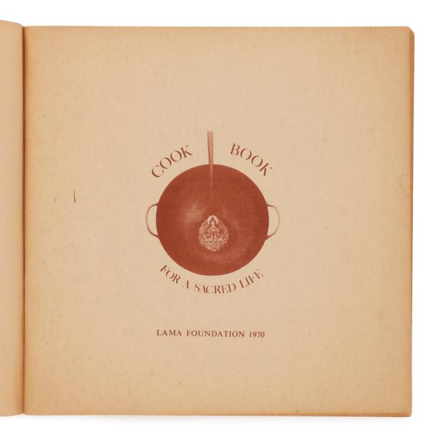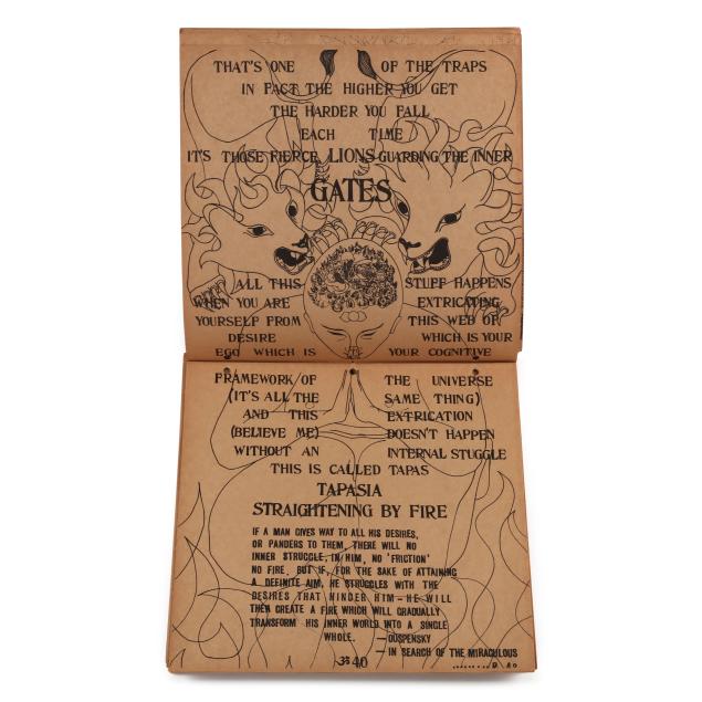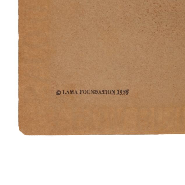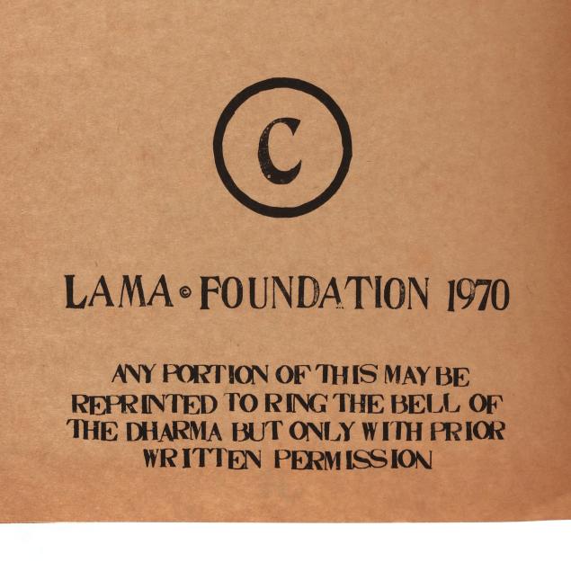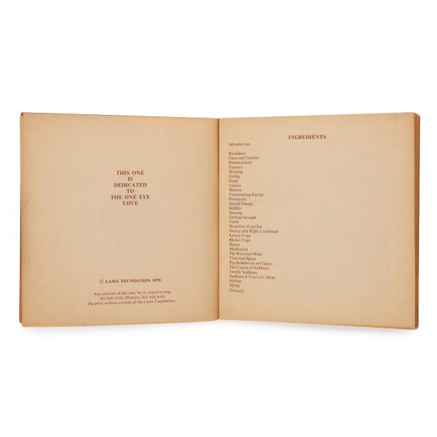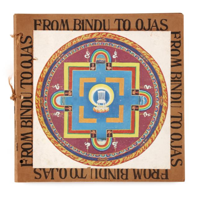 Ram Dass. FROM BINDU TO OJAS. Brown paper wraps with pictorial label featuring a mandala and kitchen chair pasted to the cover, with twine side ties. [New Mexico]: Lama Foundation, 1970. Square 4to; 108 leaves. Illustrated. This core book was originally boxed with assorted materials to create a spiritual kit; (3) of them are included in this lot: