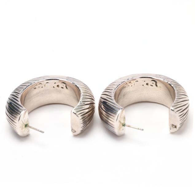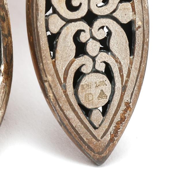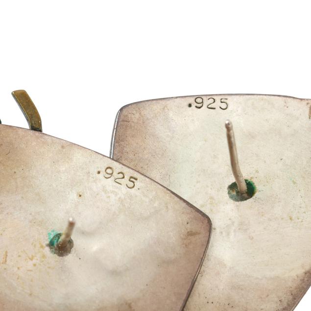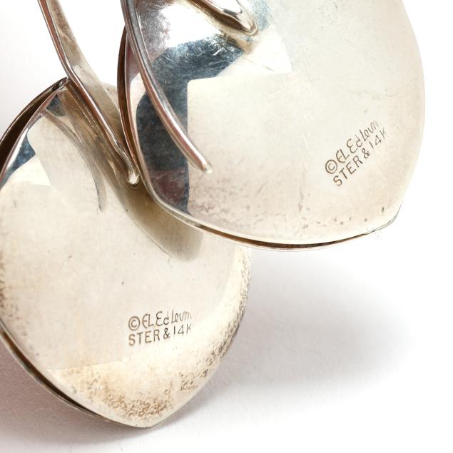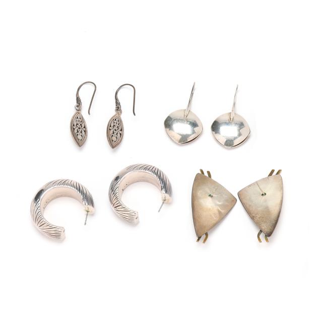 To include:a pair in a modernist fish form, set with a round cabochon cut amethyst, with gold wash wave accents, and chevron shaped designs, completed with a post, stamped .925 (1 7/8 x 1 in.); a pair of modernist drop earrings in a cushion shape, with a gold ball to the center, completed with ear hooks, signed Ed Levin, stamped STER & 14K (1.5 x 7/8 in.); a pair of dangle earrings, the ear hook with filigree suspending a navette form dangle with scrolled and gold accents, stamped with a maker's mark and 925 18K (1.75 x 3/8 in.); and a pair of large silver hoops with sunburst motif detailing, completed with posts, testing silver (1 3/8 in. x 12mm).