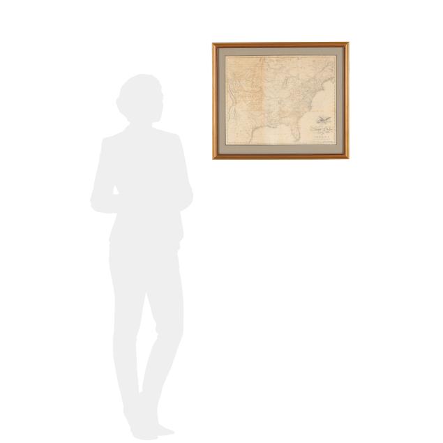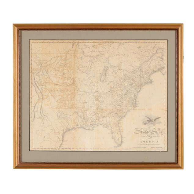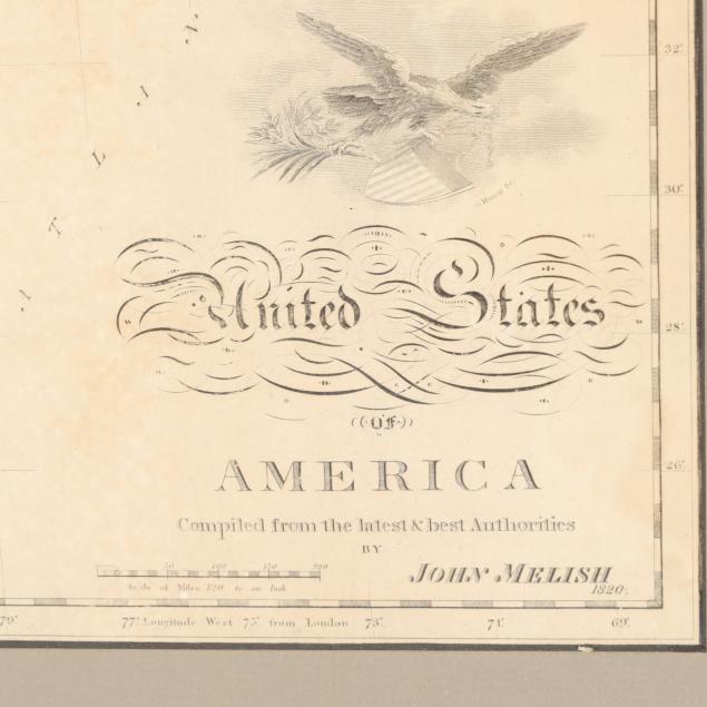 John Melish. UNITED STATES OF AMERICA COMPILED FROM THE LATEST & BEST AUTHORITIES. Philadelphia: John Melish, 1822. Map dated 1820 with "Entered according to Act of Congress 10th. July 1818. and Published by John Melish PHILADELPHIA. Improved to 1822" stated in lower margin. Engraved by Samuel Harrison. The map presents the United States from the eastern seaboard, west to include "Missouri Territory" with the note "Clarks Canoes / stop 3,000 / miles from the / Mississippi" at the far left edge of the map, and south down to Mexico, including Texas; with the title partially in script below a vignette of an eagle and shield; presented matted and in gilt wooden frame.