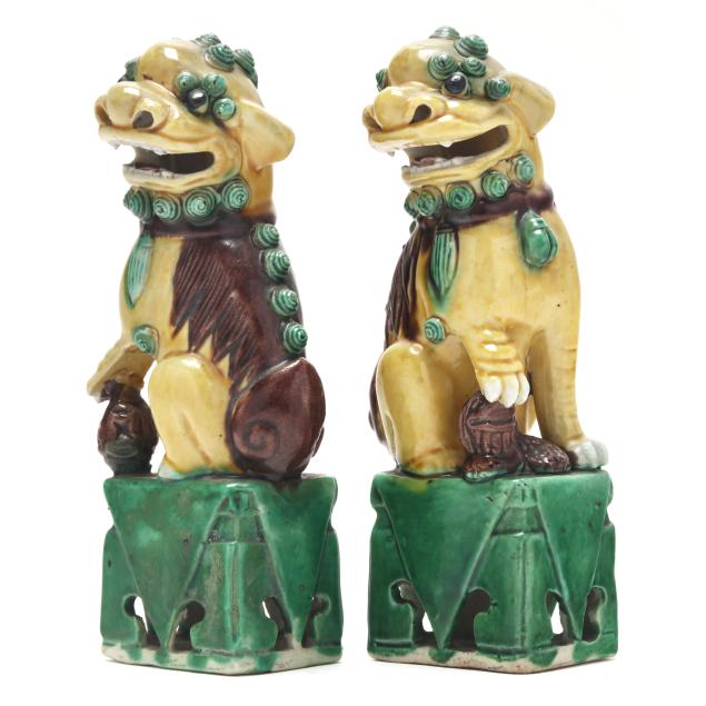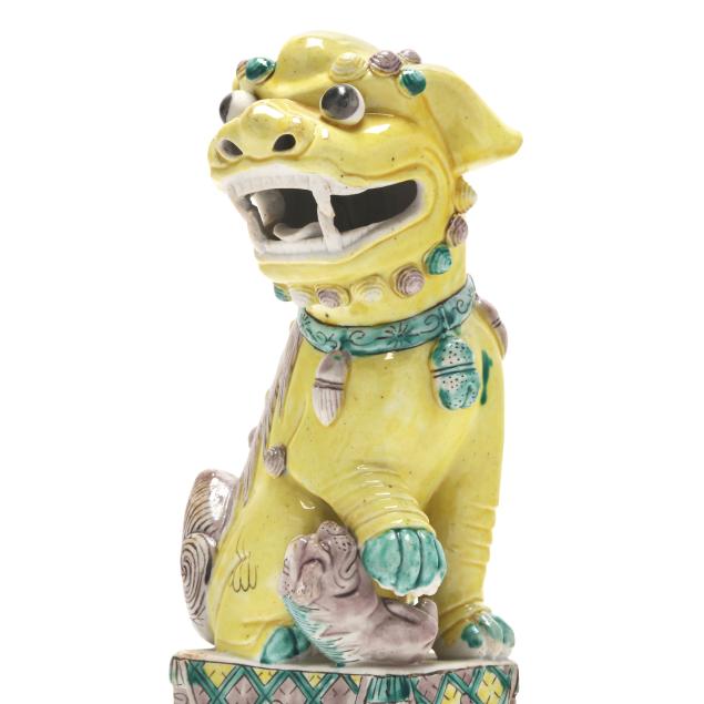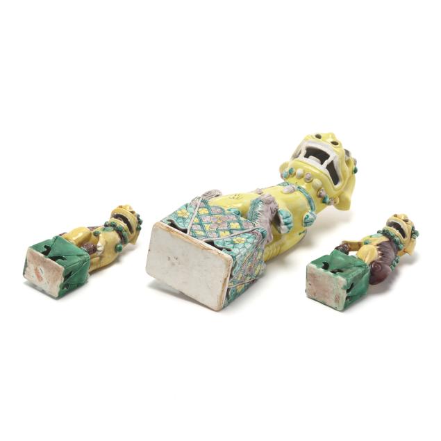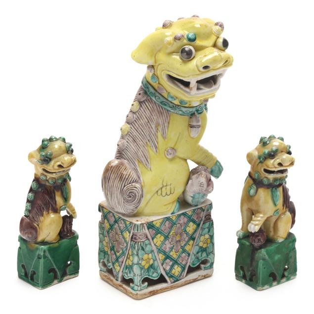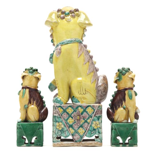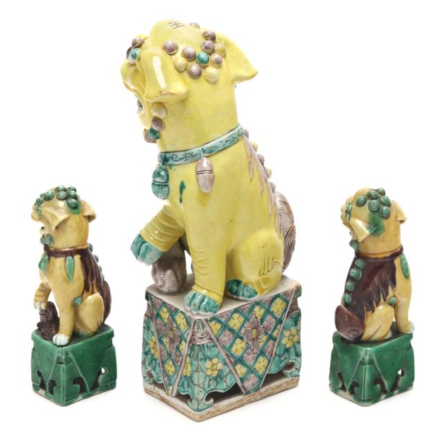 Qing dynasty (1644-1912), 19th century, the largest lion glazed in yellow and seated with front paw resting on a baby cub atop a tall base decorated in floral and geometric patterns in green, yellow, and aubergine, and a smaller pair of foo lions in darker colors and standing atop green bases, the pair marked "CHINA" to the underside.