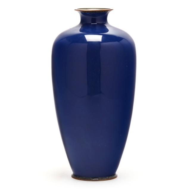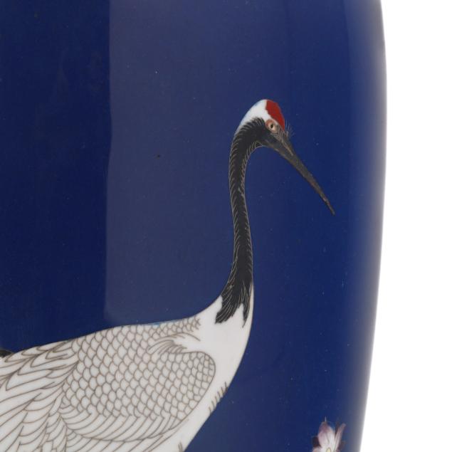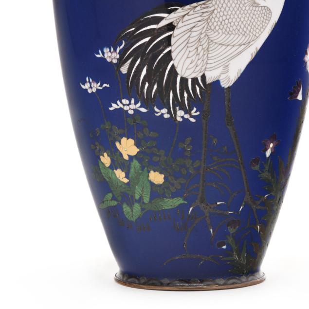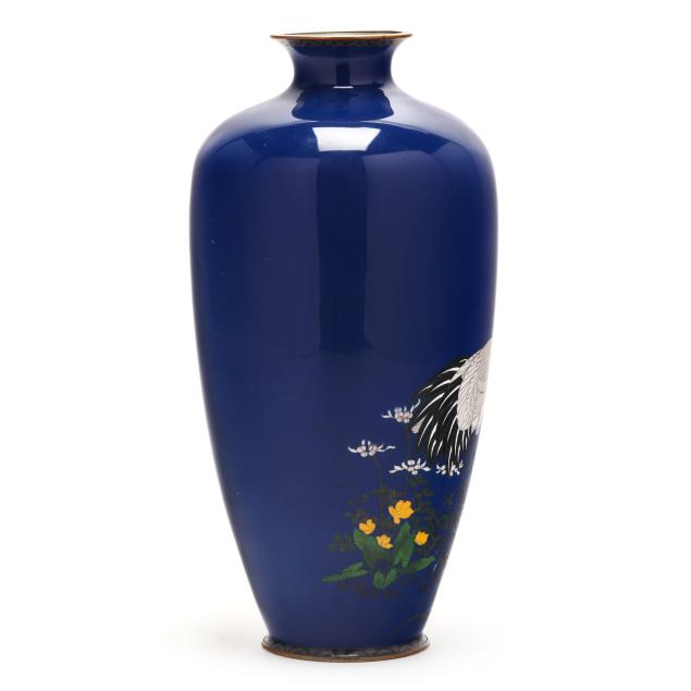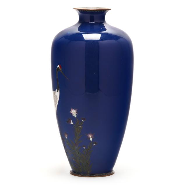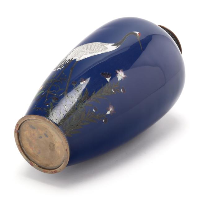 Meiji period (1868-1912) or Taisho era (1912-1926), worked in wire of varying gauge with a red crested crane walking in a flowering meadow, on a vivid cobalt blue ground, applied with a brass neck and foot rim, unmarked.