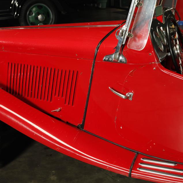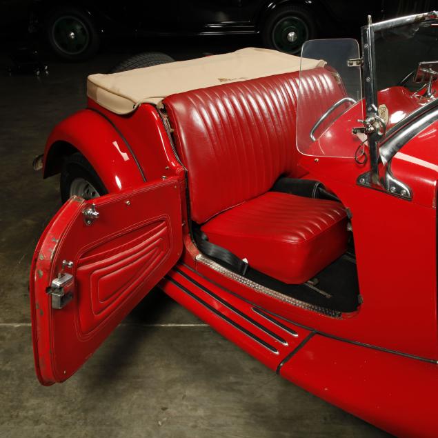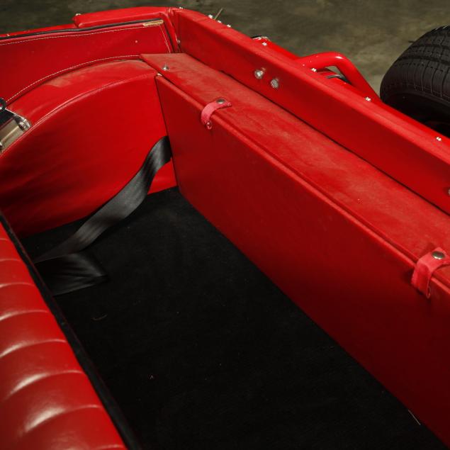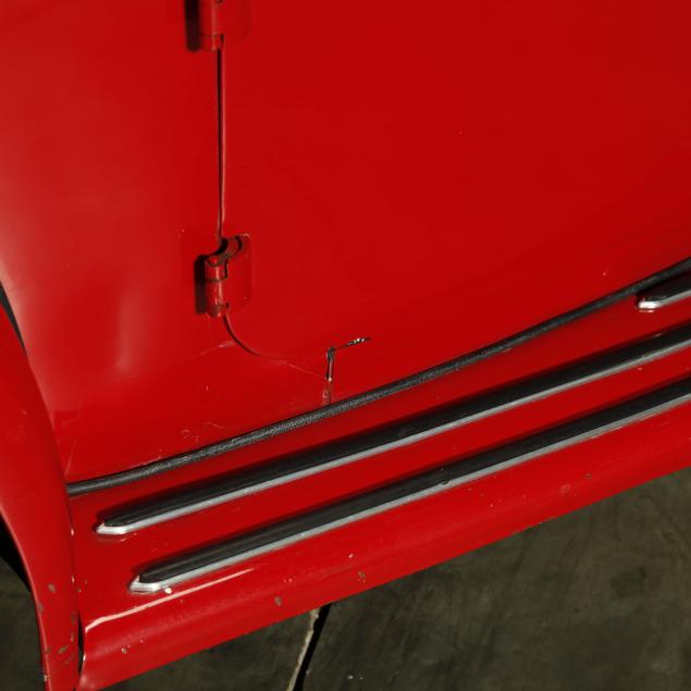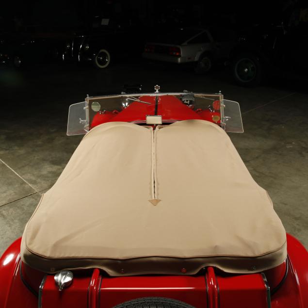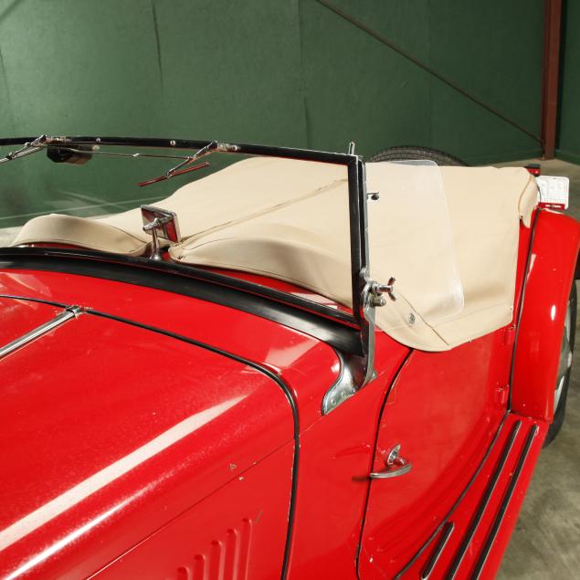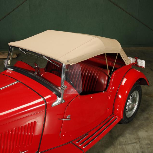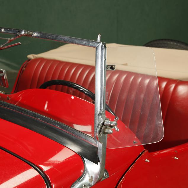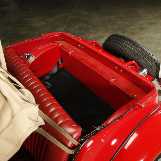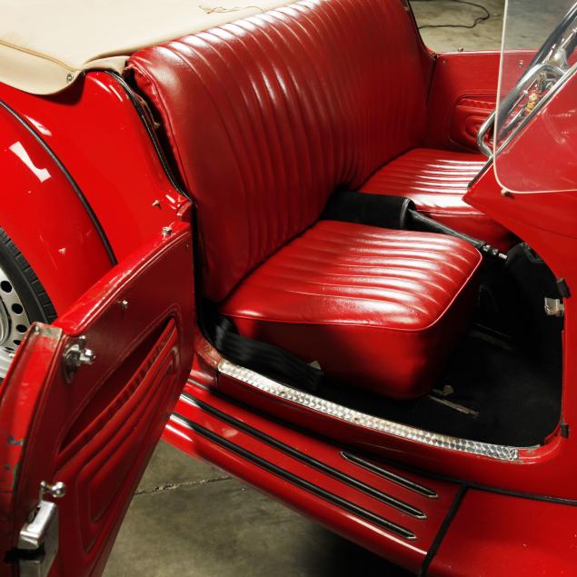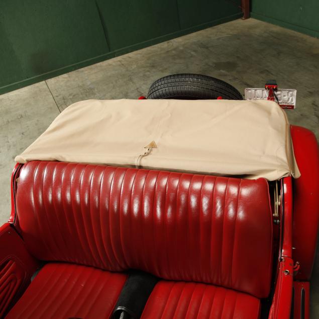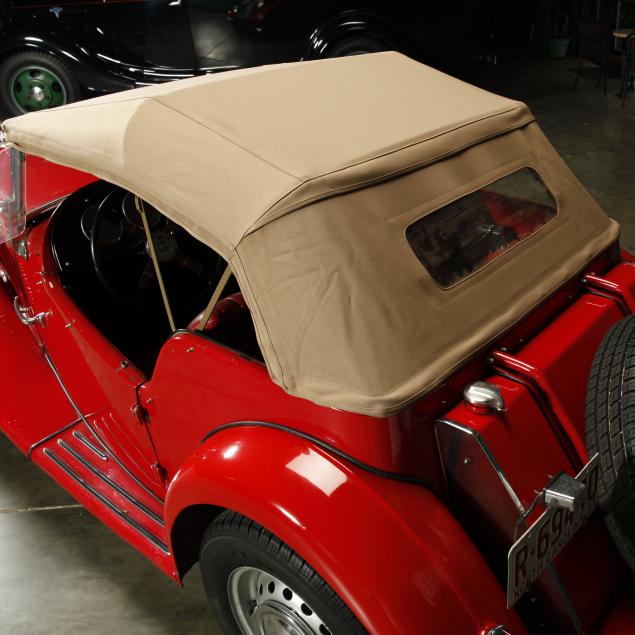 Exterior in red paint, a red interior, and a tan canvas convertible top. A matching tonneau, and side screens are also included.