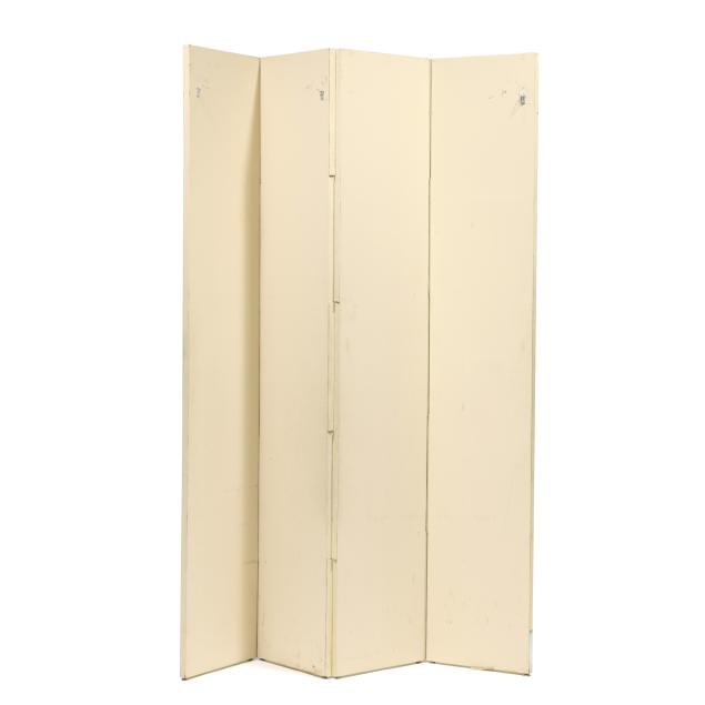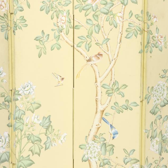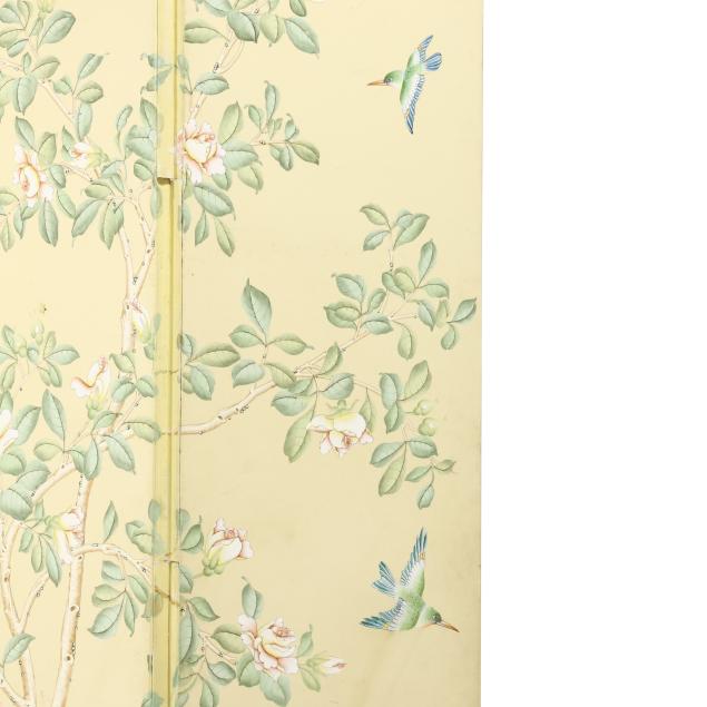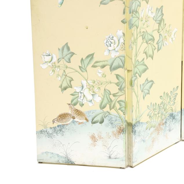 Second half 20th century, hand painted board and canvas with pale yellow field, flowering trees, insects and bird motifs, canvas hinges, flush base, appears unmarked, back-side in plain yellow paint.