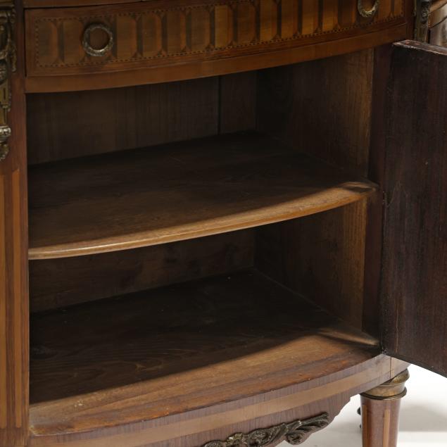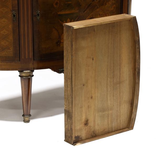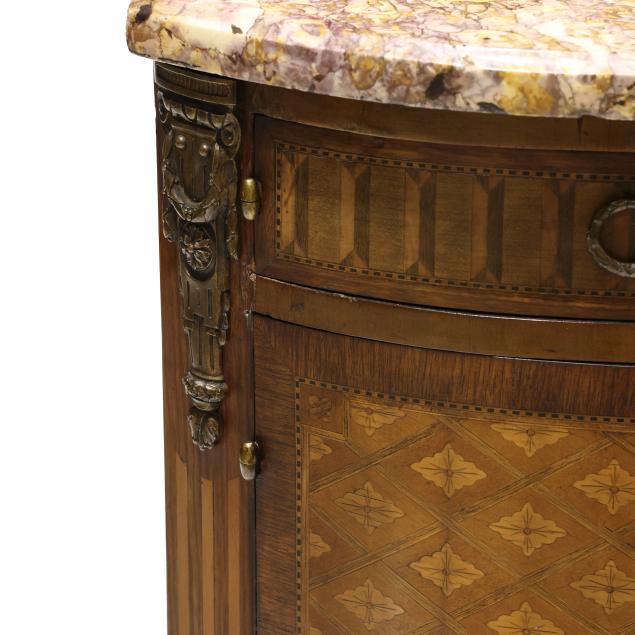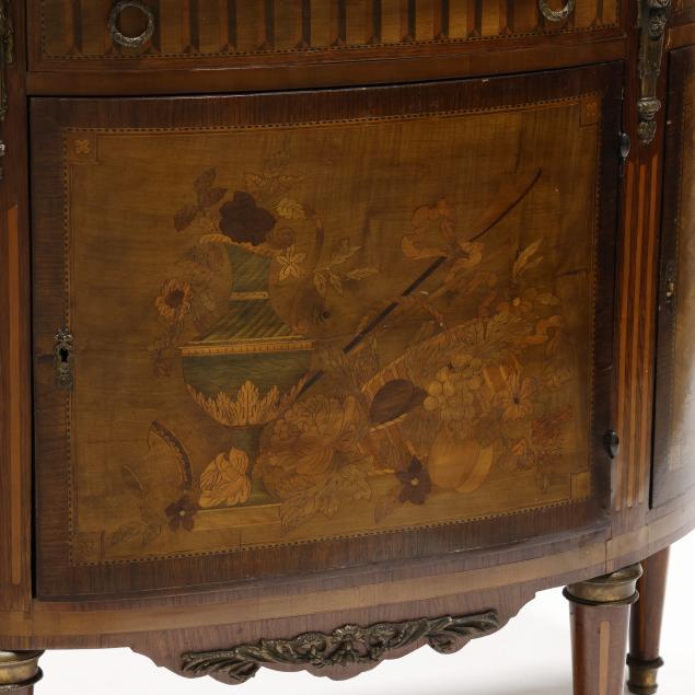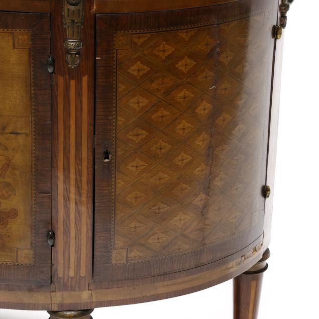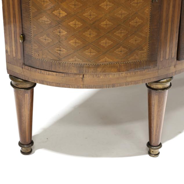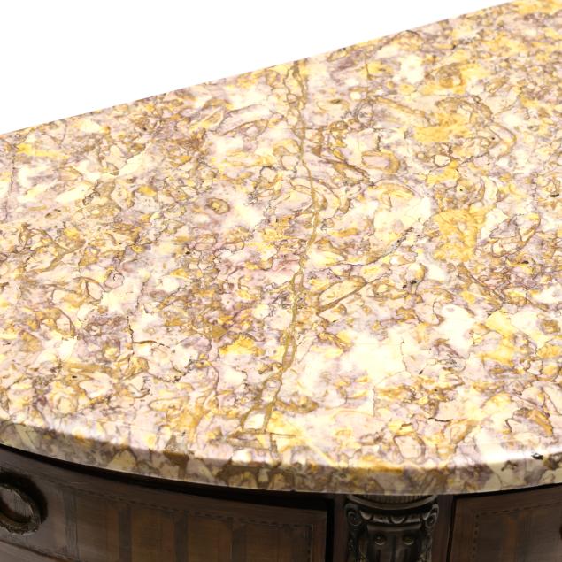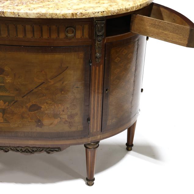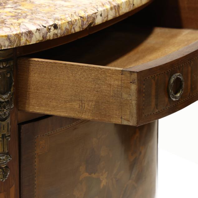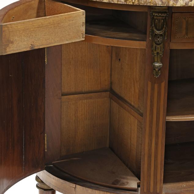 First half 20th century, ochre marble top with molded edge, mahogany and mixed wood veneer case with oak secondary featuring central conforming drawer flanked by two hinged triangular shaped drawers, over three conforming hinged cabinet doors, divided and shelved interior, raised on turned tapered legs with inlaid faux fluting and brass capped feet, the whole case with geometric inlaid panels, faux fluting and central still life inlay featuring ewer and grape basket.