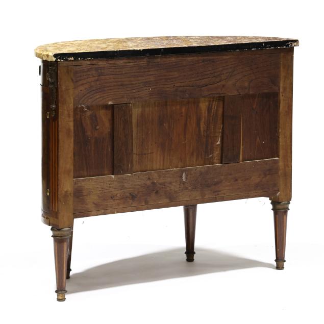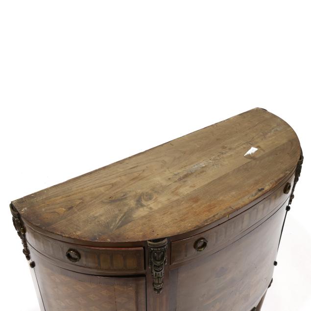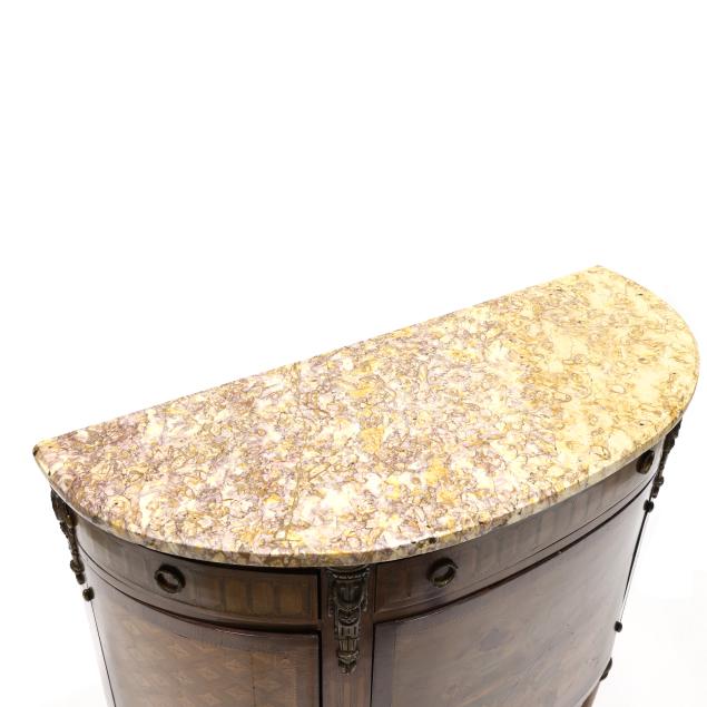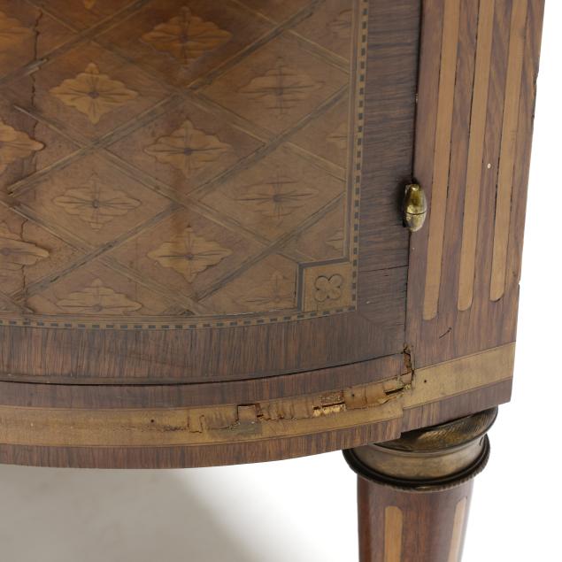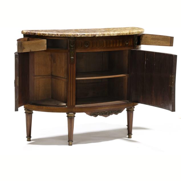 Marble top with break and repair; some minor edge chipping; some small areas of veneer chipping especially at edges; the side cabinet doors with vertical veneer shrinkage cracks; veneer cracks near rear right foot base edges; one escutcheon is detached (but present); far right cabinet door is locked and unable to open.