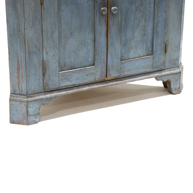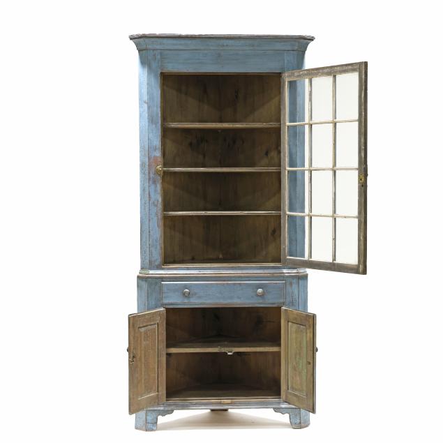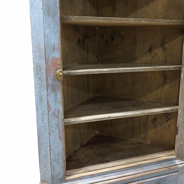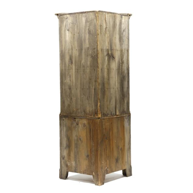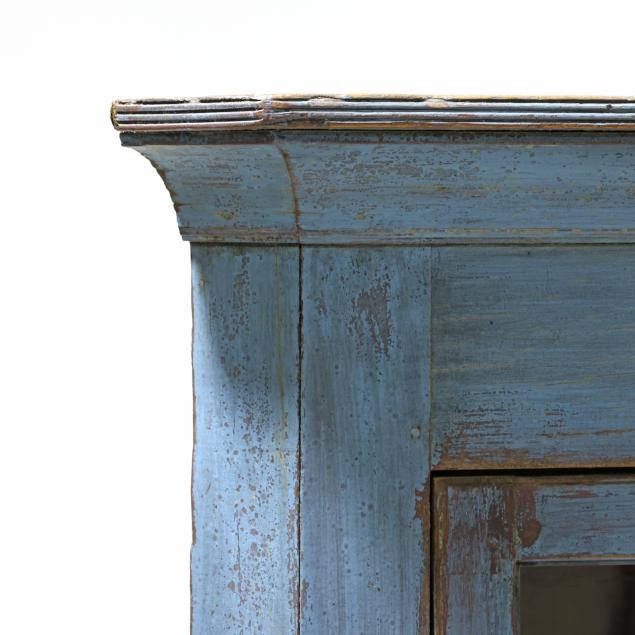 20th century construction from 19th century pine boards and nails, two part form, upper case with cove molded cornice, single hinged door with twelve window lights, shelved interior, the lower case with a single beveled edge drawer over two hinged paneled doors, shelved interior, shaped bracket foot base.