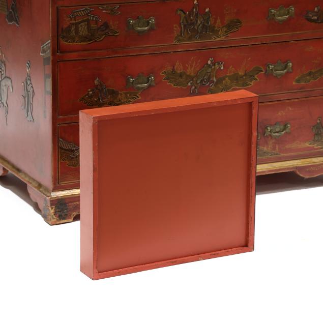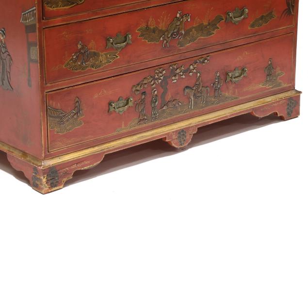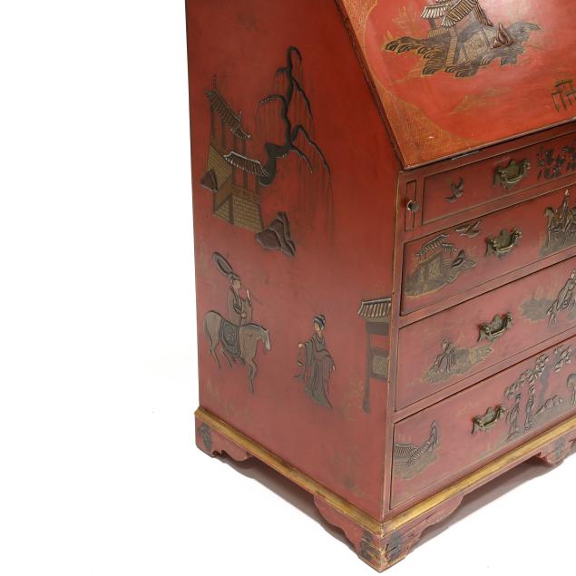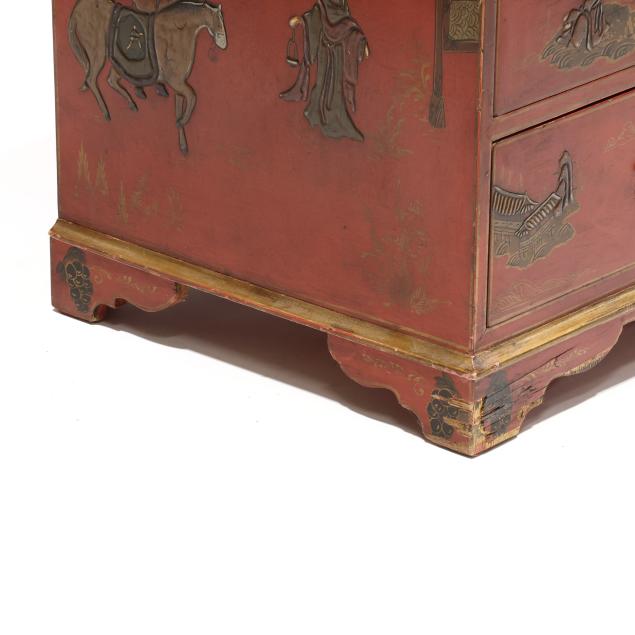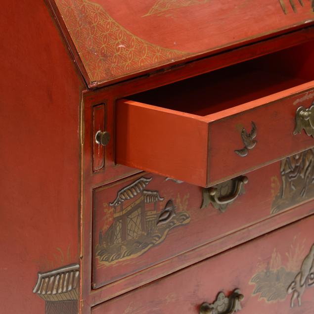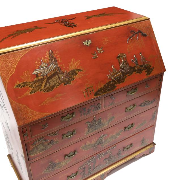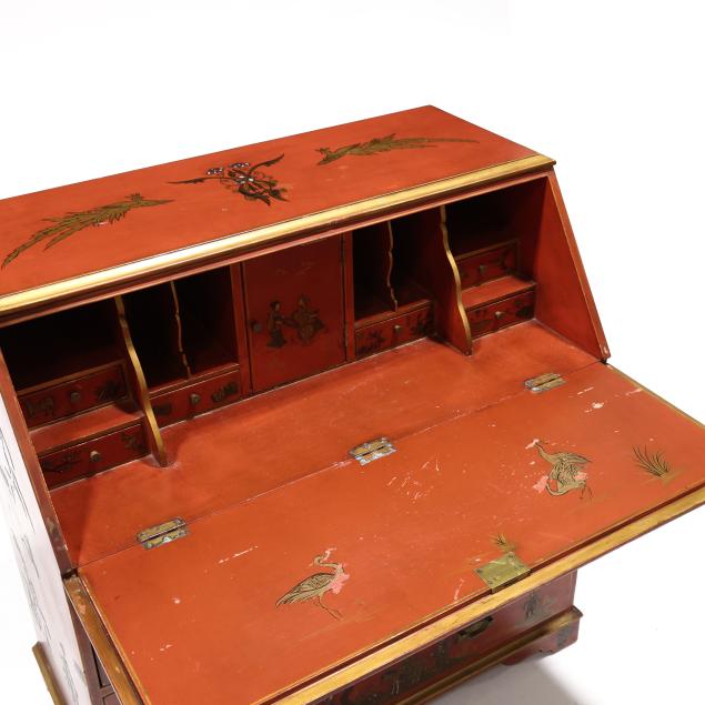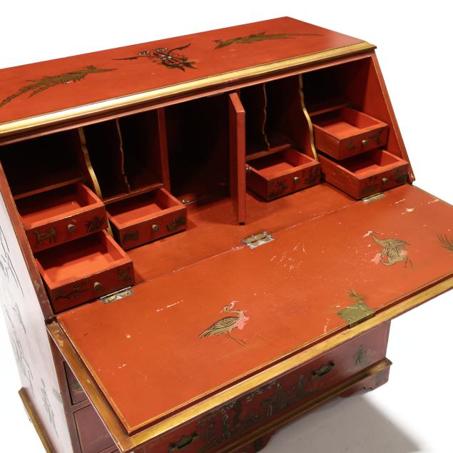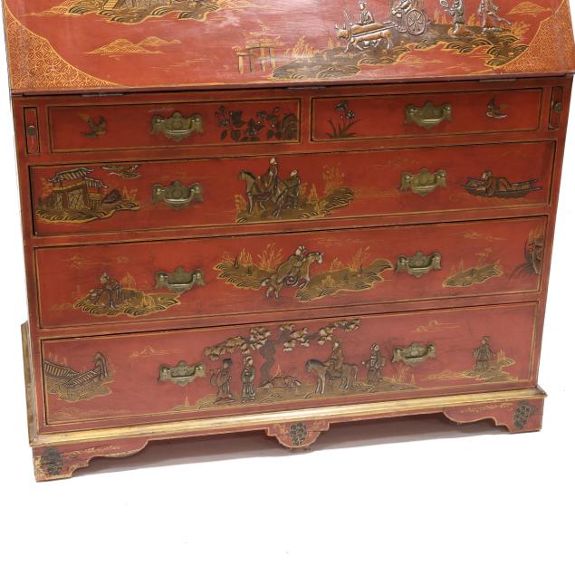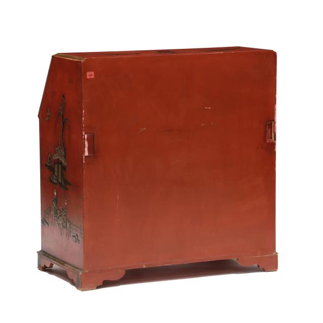Mid 20th century, red lacquered field with raised, painted and gilt highlights, hinged slant lid with loper supports, divided and drawered interior with central prospect door, the case with two over three graduated flush drawers, bracket foot base.