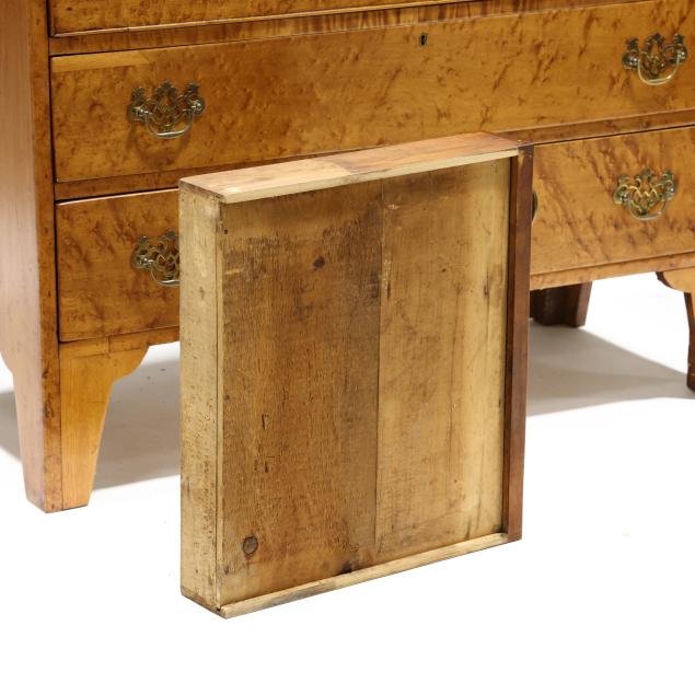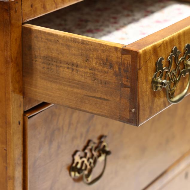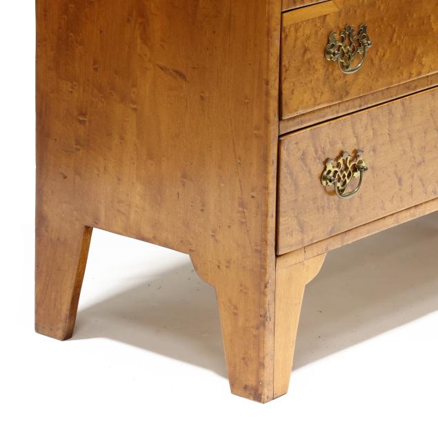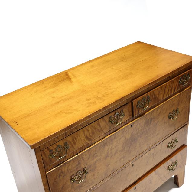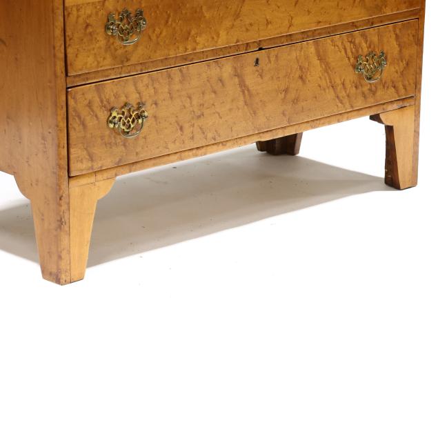 Circa 1820, maple and maple veneer, poplar and white pine secondary, rectangular top with applied burled edge, two upper side-by-side drawers in tiger maple veneer over three drawers in birds eye maple veneer, all cock beaded, straight bracket feet.
