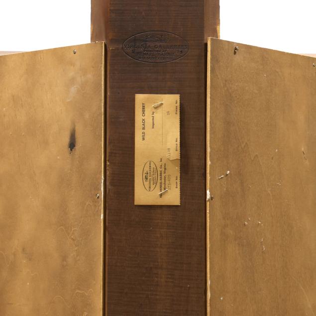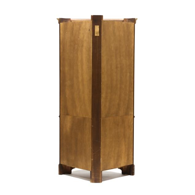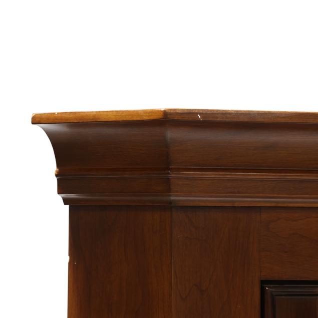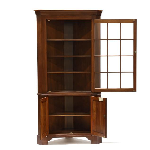 Late 20th century, one part form, finish no 24, cove molded cornice, single upper hinged door with twelve window lights, butterfly shelf interior with dish groove, lower case with two hinged raised panel doors with shelved interior, straight bracket feet, labeled.