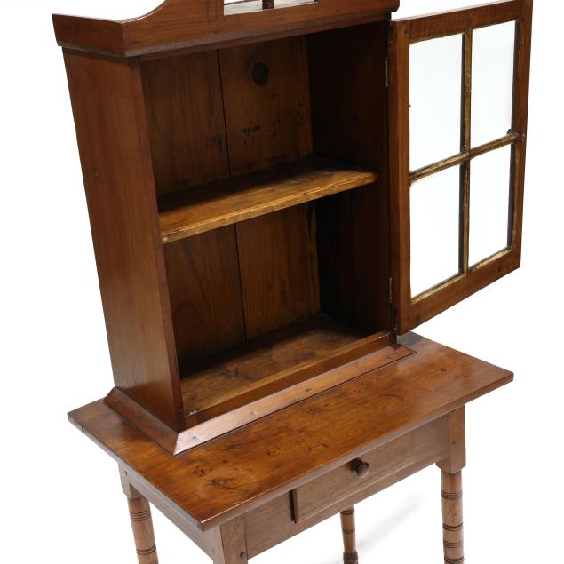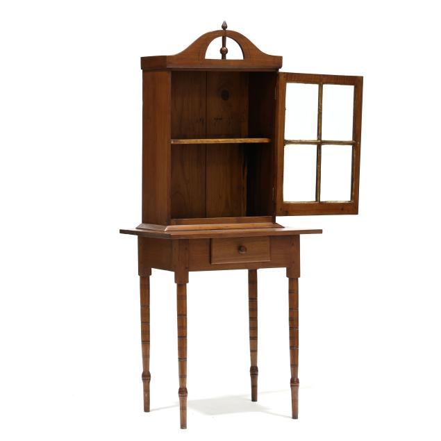 Mid 19th century, poplar and yellow pine secondary, one part form, upper step-back cabinet with a distinctive broken arched pediment with turned finial, hinged door with four window lights, shelved interior, applied waist trim, the stand with wide over-hang, single lipped drawer, tall ring turned legs.