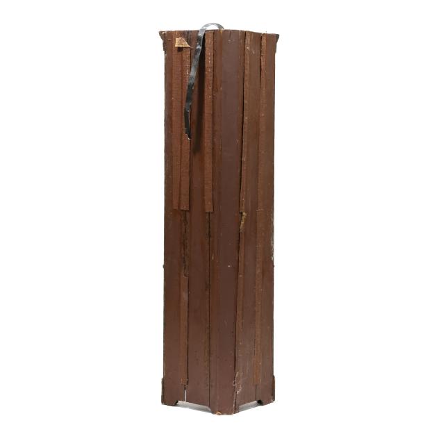 Circa 1900, one part form, pine and mixed wood, later grey paint with gilt highlights, molded cornice, upper hinged door with beveled glass pane, golden velvet lined and shelved interior, lower asymmetrical panel door with painted shelf interior, floral and stop fluted stiles, straight bracket foot base.