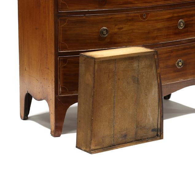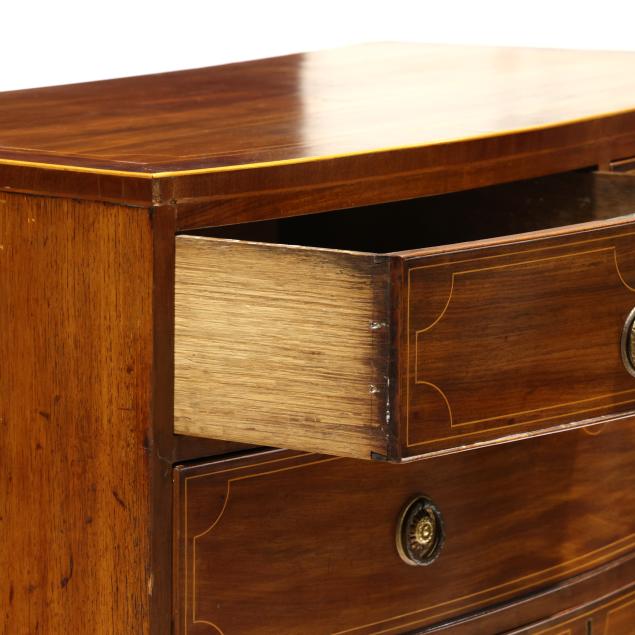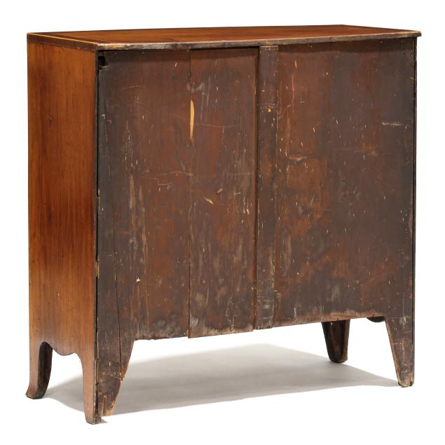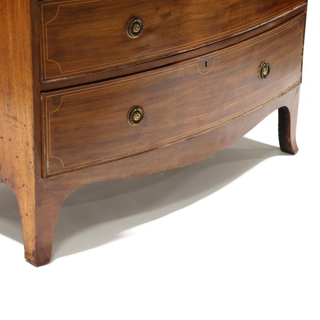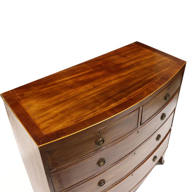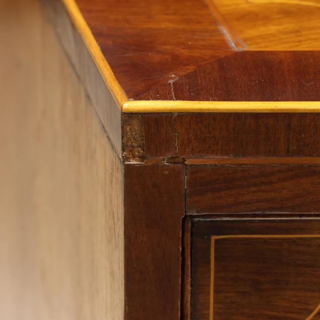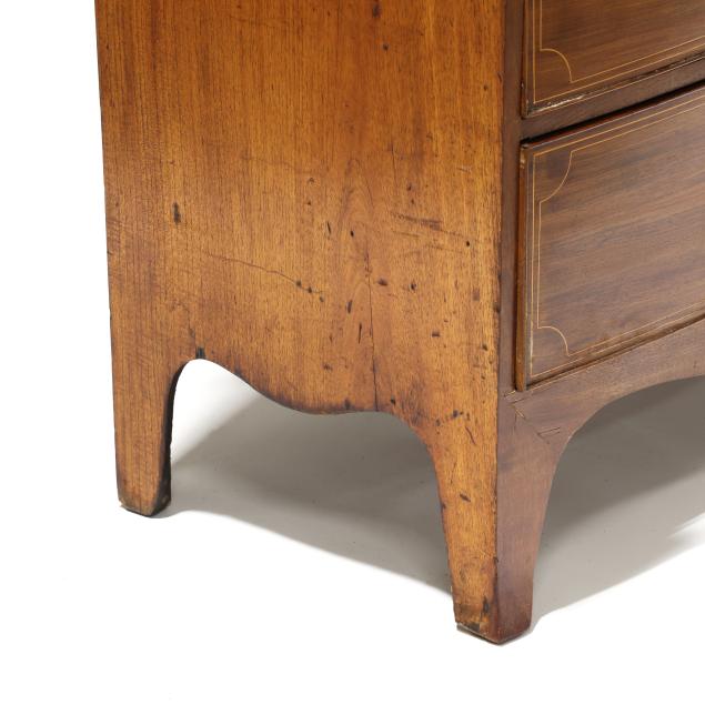 Circa 1790-1810, mahogany and mixed wood veneers, oak and pine secondary, banded top with light wood line inlay, two over three conforming graduated cock beaded drawers with repeating line inlays, drop skirt, French bracket feet.