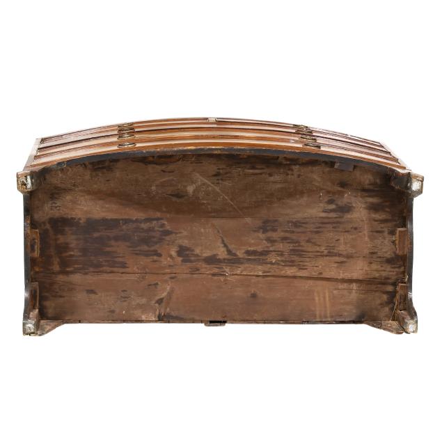 From the Collection of Rose Browning, Hendersonville, North Carolina Top with dark scratch near center; later pulls covering off-set hole; old marring to case sides; break and repair to rear right foot; front left foot facing with break and repair.
